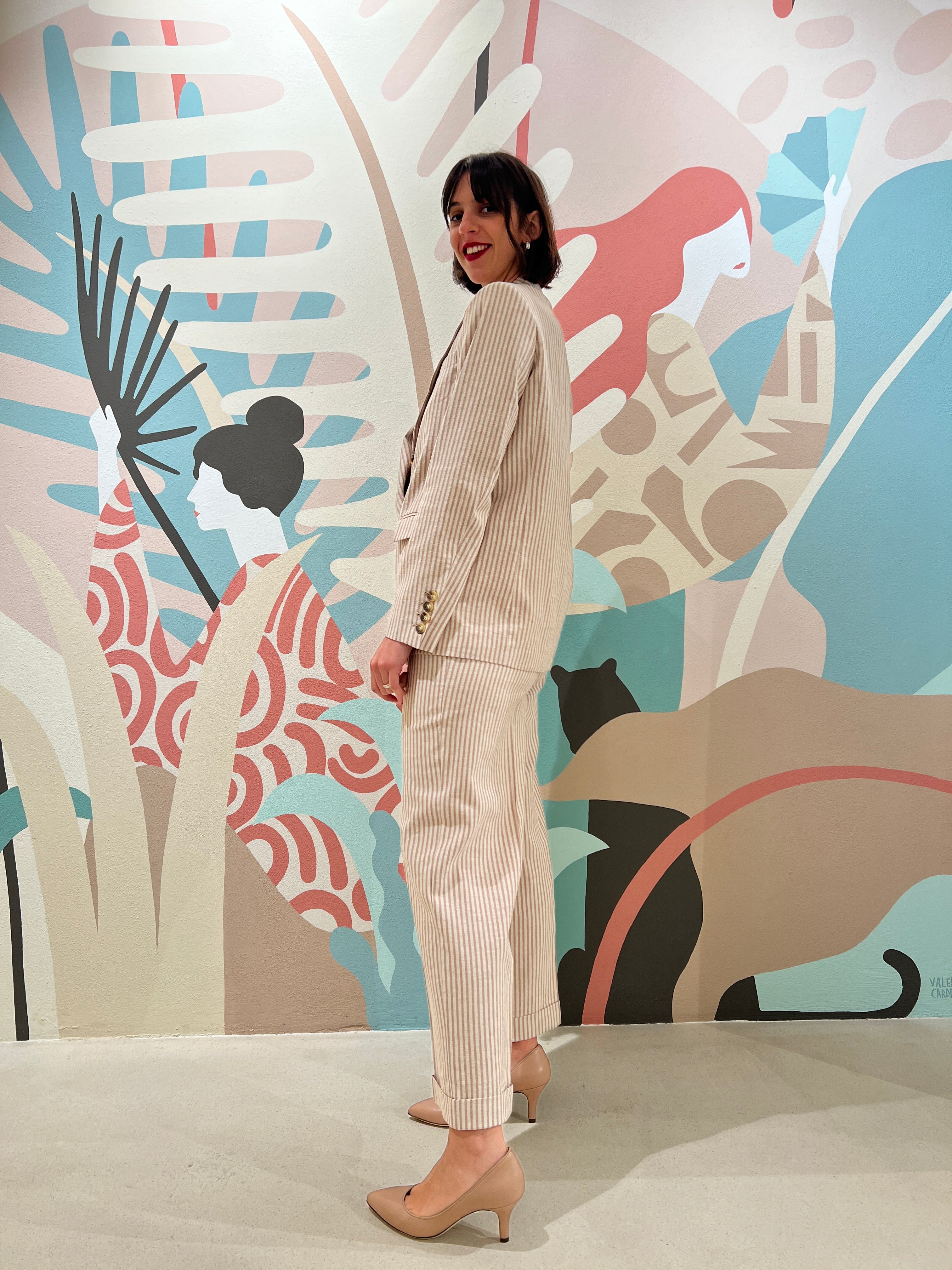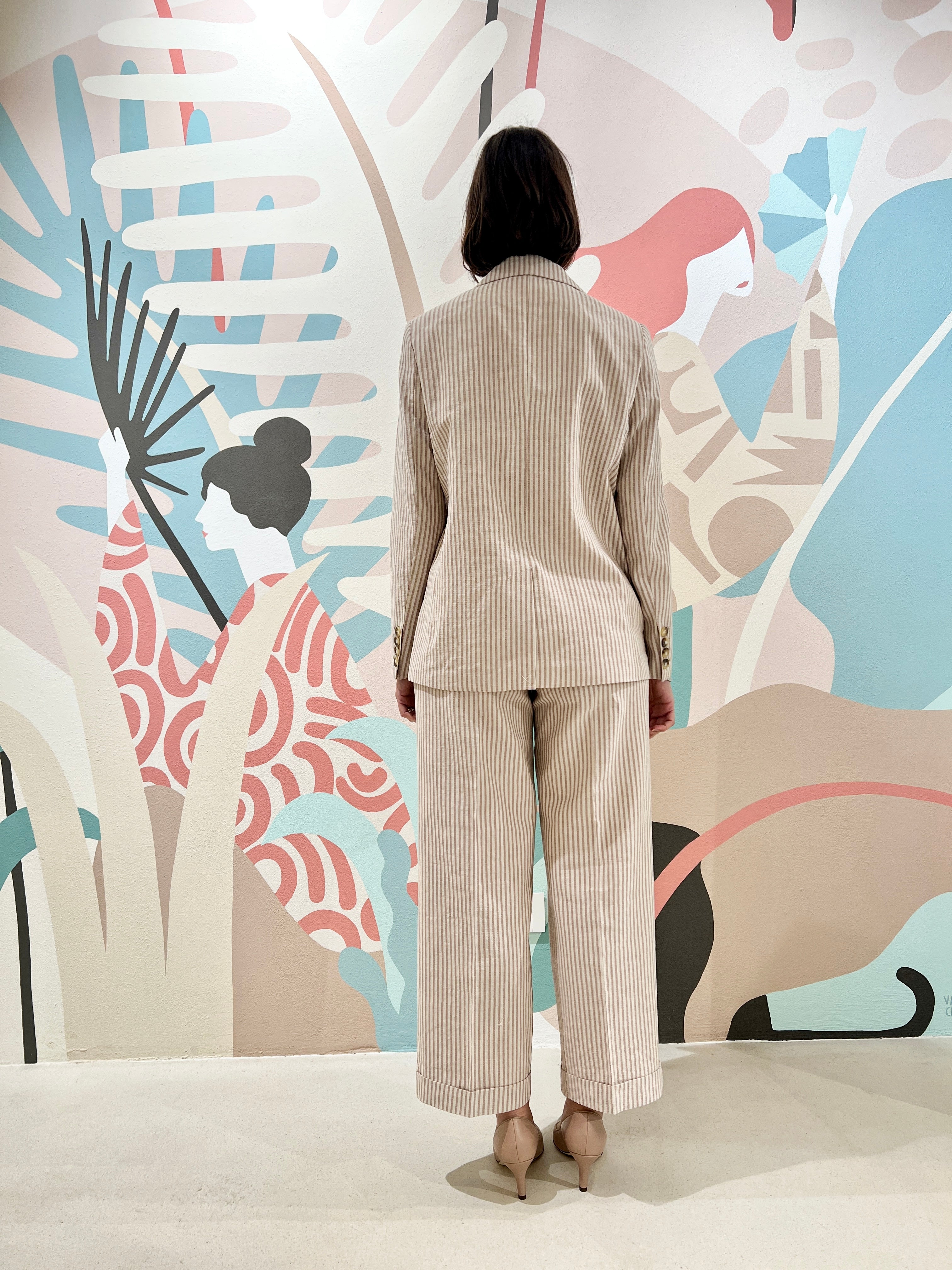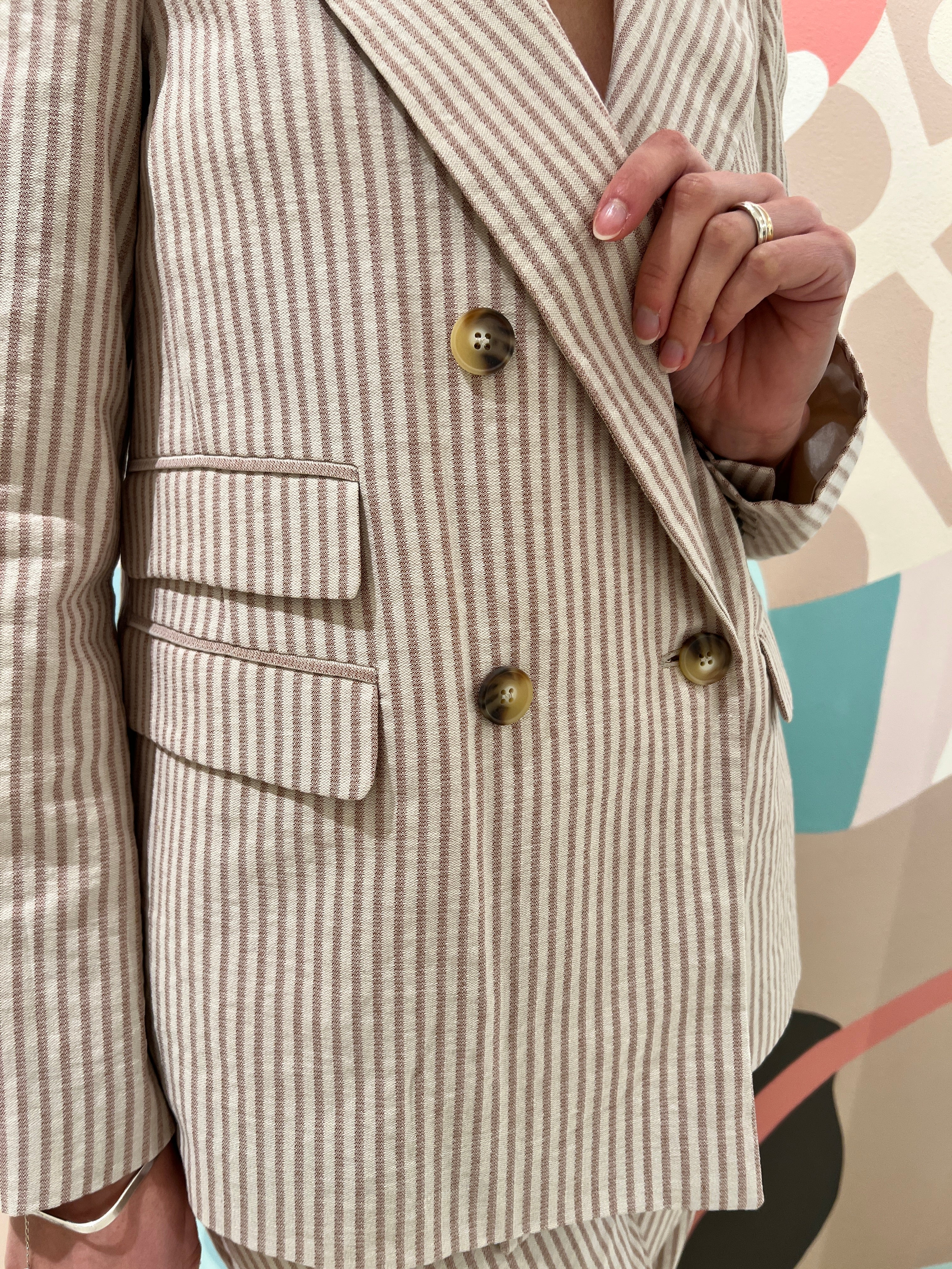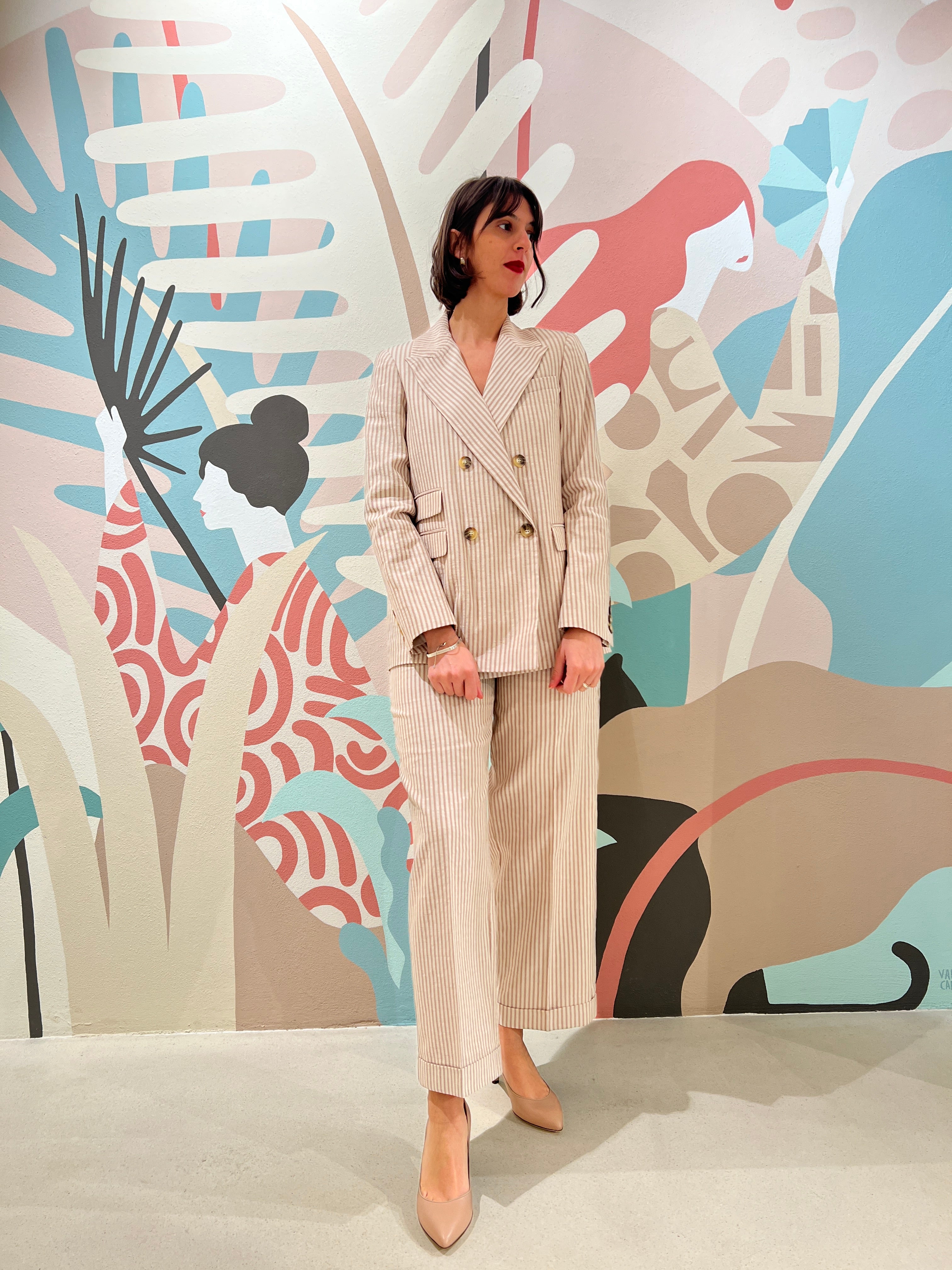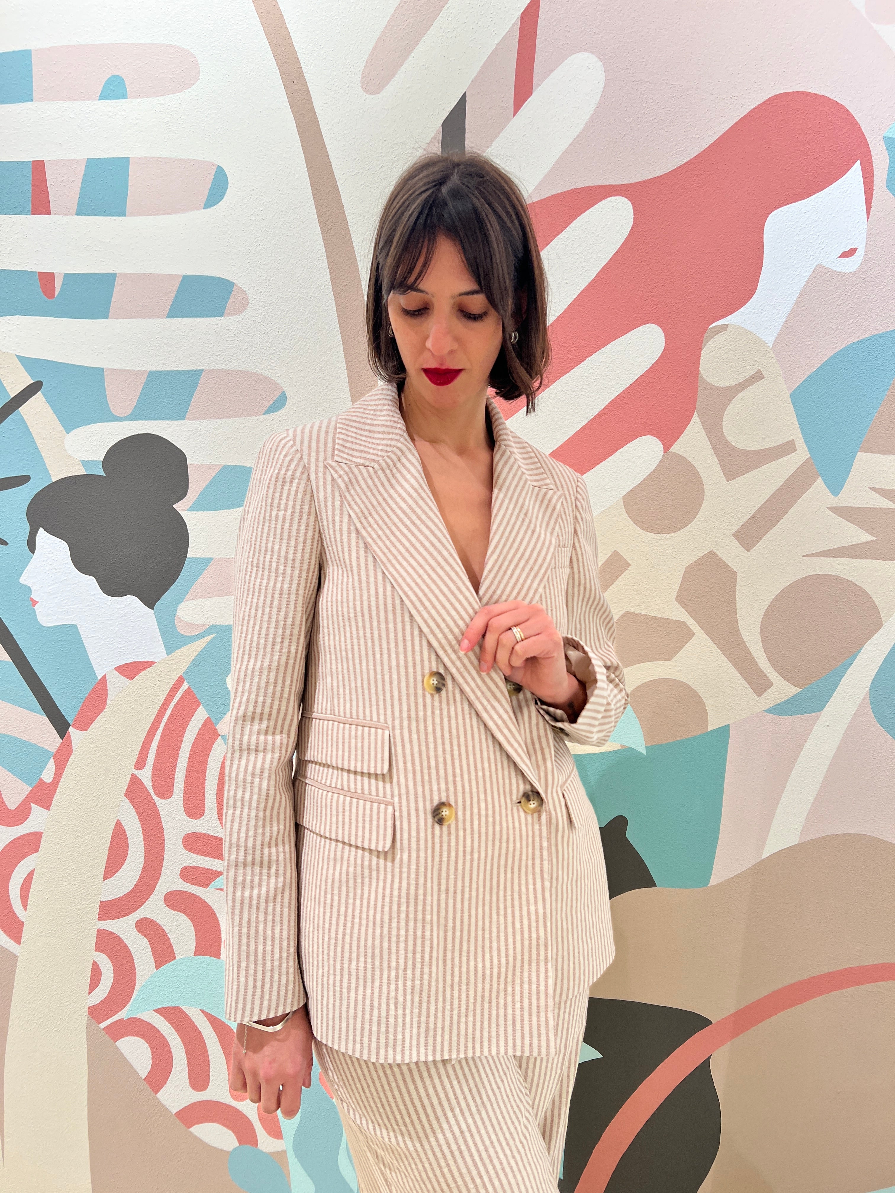 Giacca in riga bicolore di cotone e canapa, dalla vestibilitá regolare, doppio petto e collo a lancia. Pinces sul davanti e dettaglio doppia taschina con patta sul lato destro indossato. Dietro con spacco. Costruzione interamente foderata.