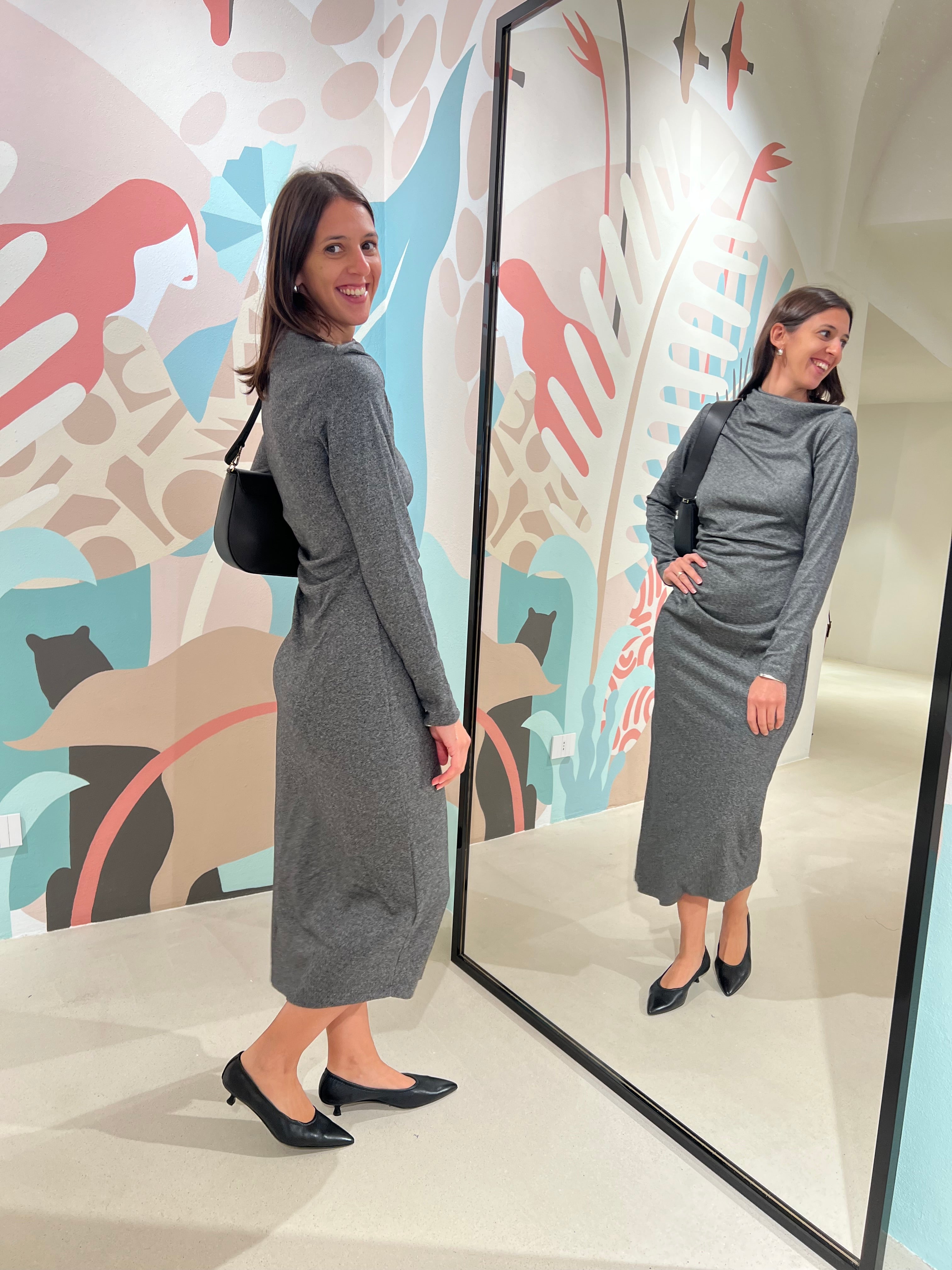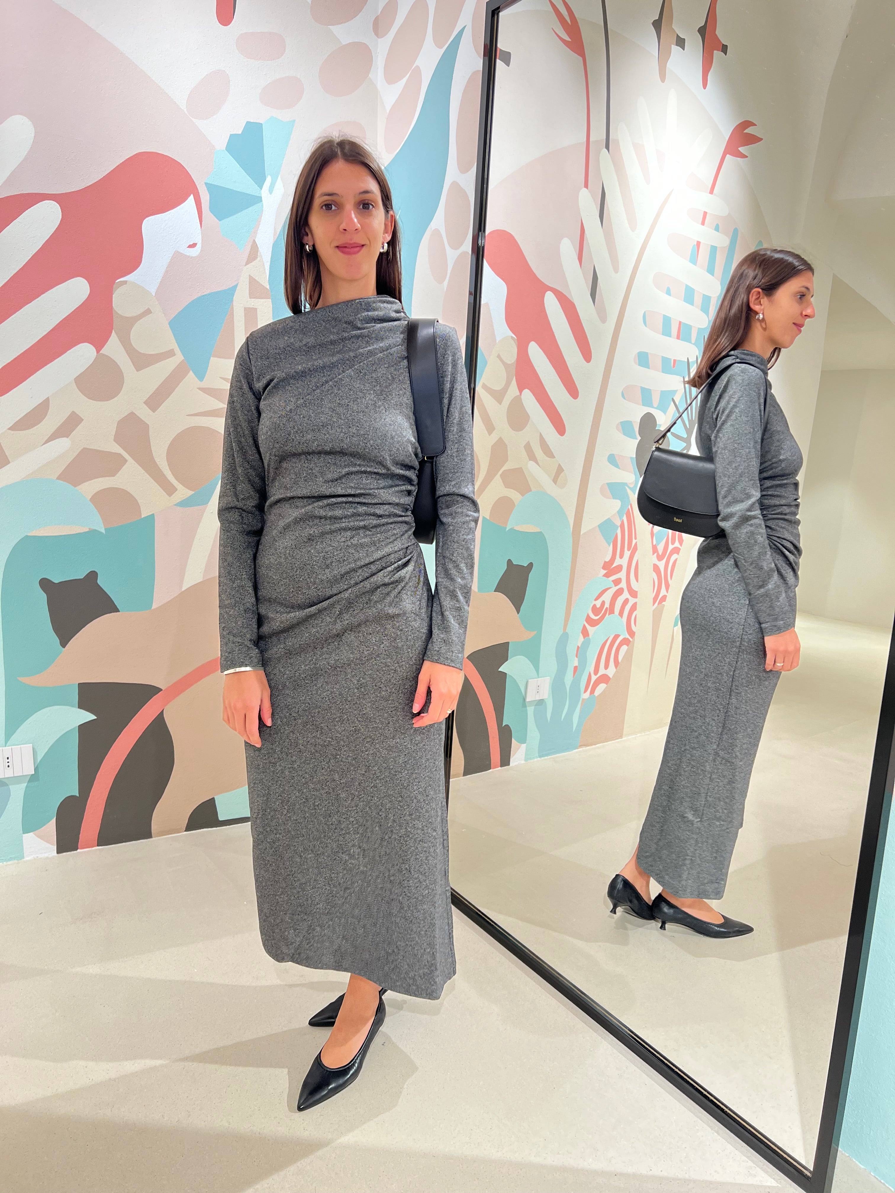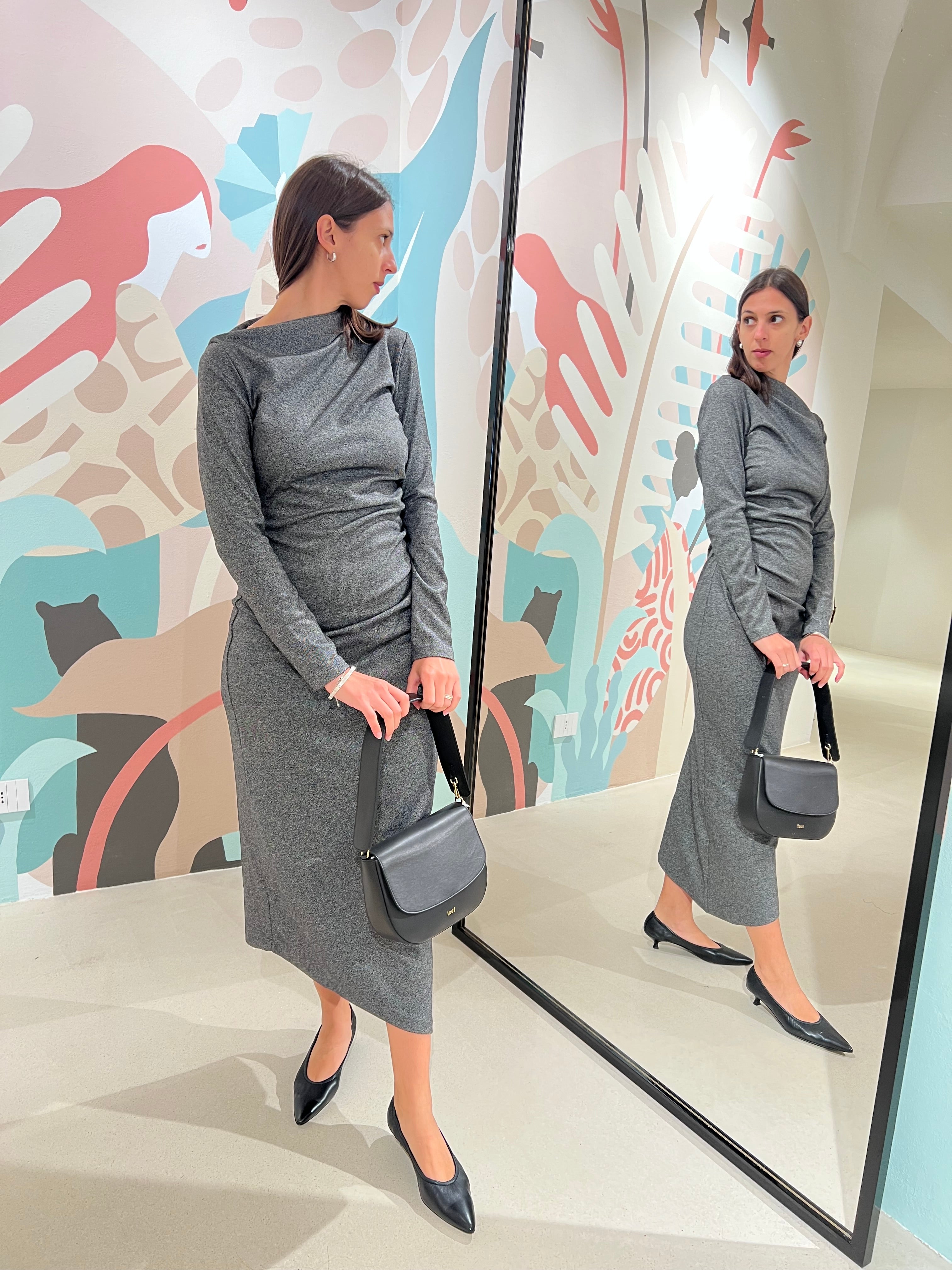 Abito lunghezza midi con arricciatura sul fianco e collo a cratere