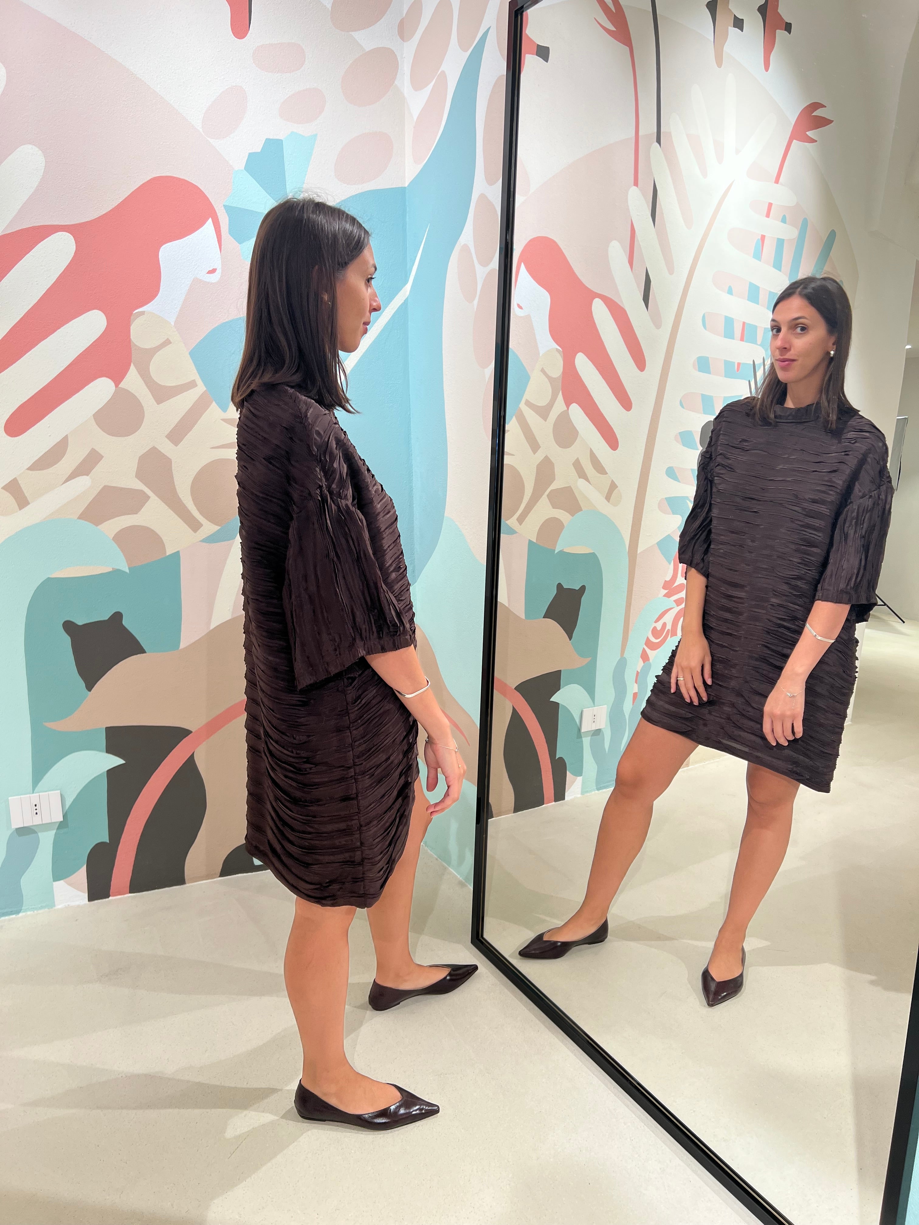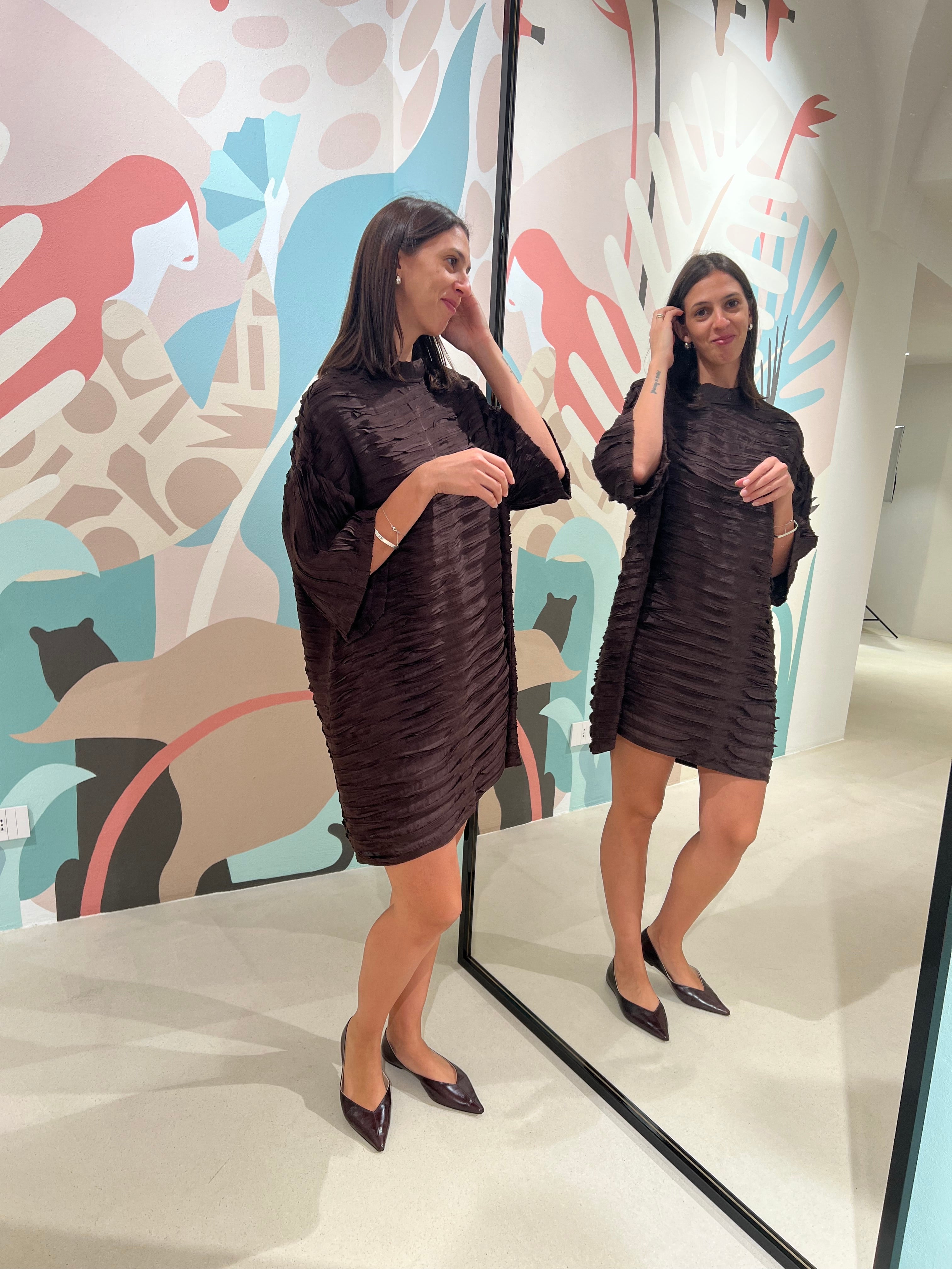 Abito origami a manica corta con colletto a camicia color cioccolato