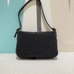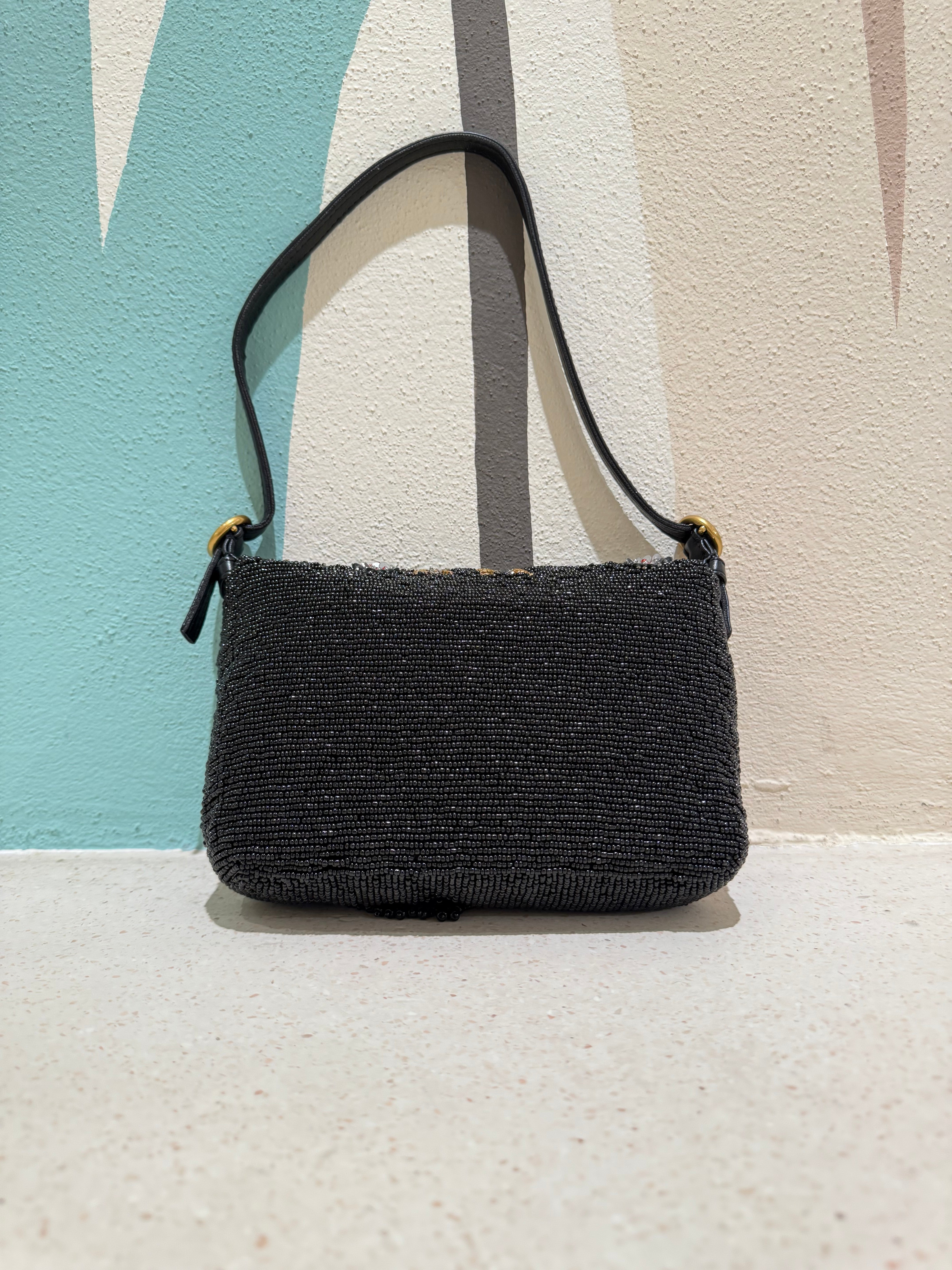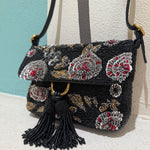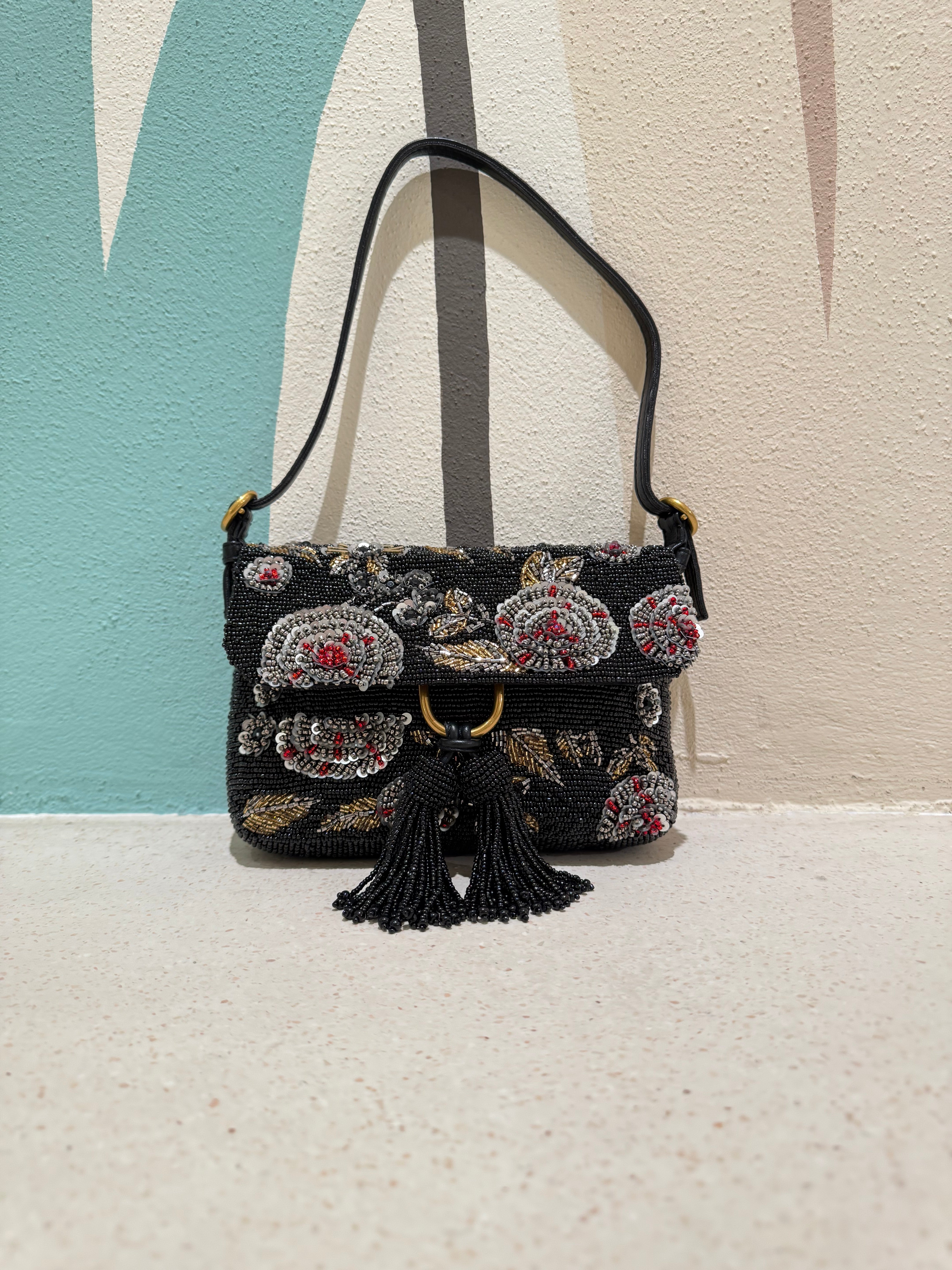 Un giardino invernale totalmente ricamato a mano. Questa mini baguette è un vero gioiello di perline, paillettes e cuts ricamati con amore, uno ad uno, fino a comporre un delicato disegno floreale. Un anello metal e due nappine totalmente ricamate ne completano la chiusura. La tracolla in pelle tono su tono è chiusa da fibbie gold logate.