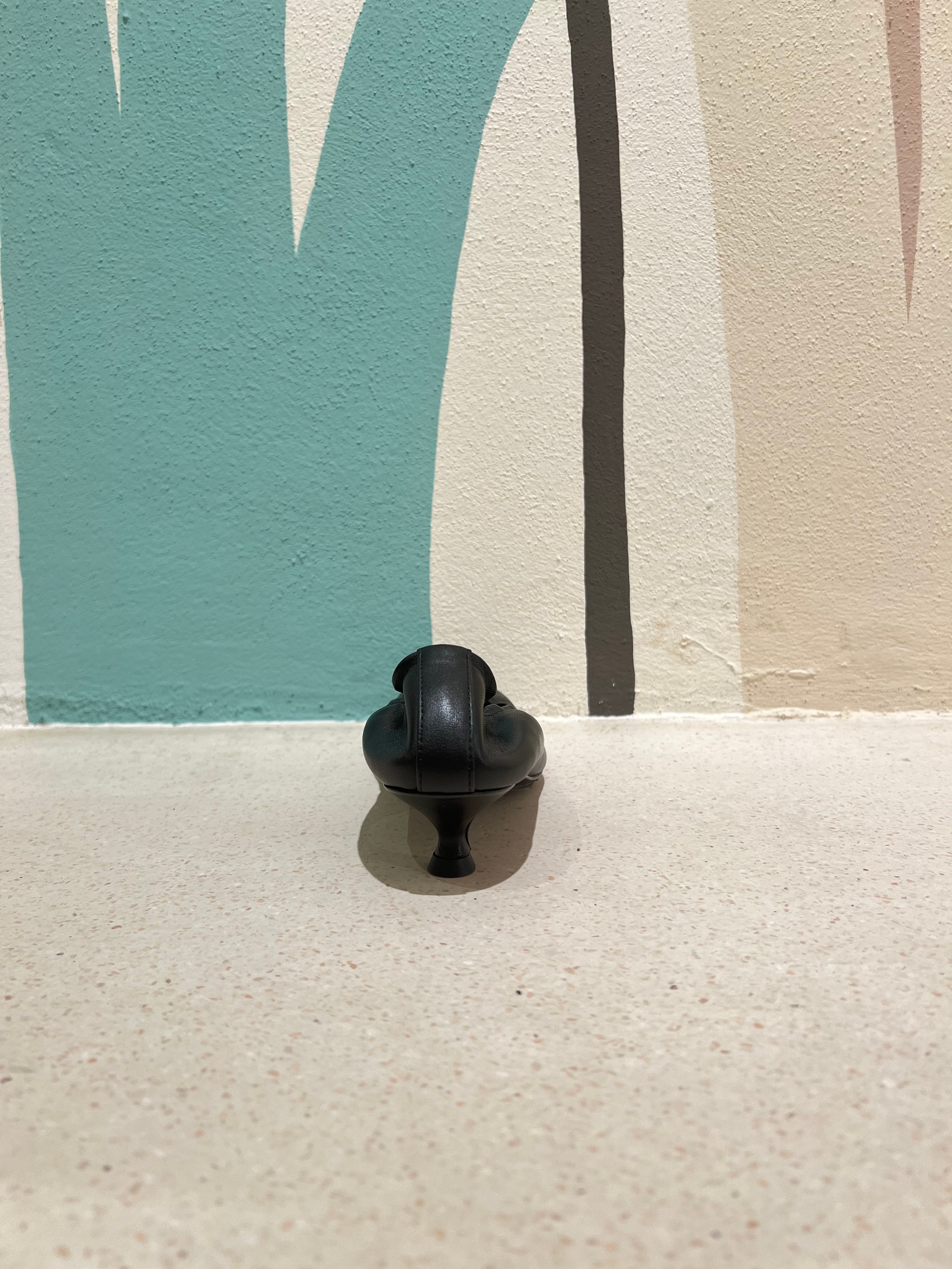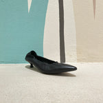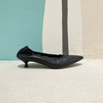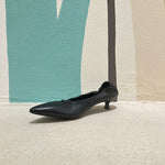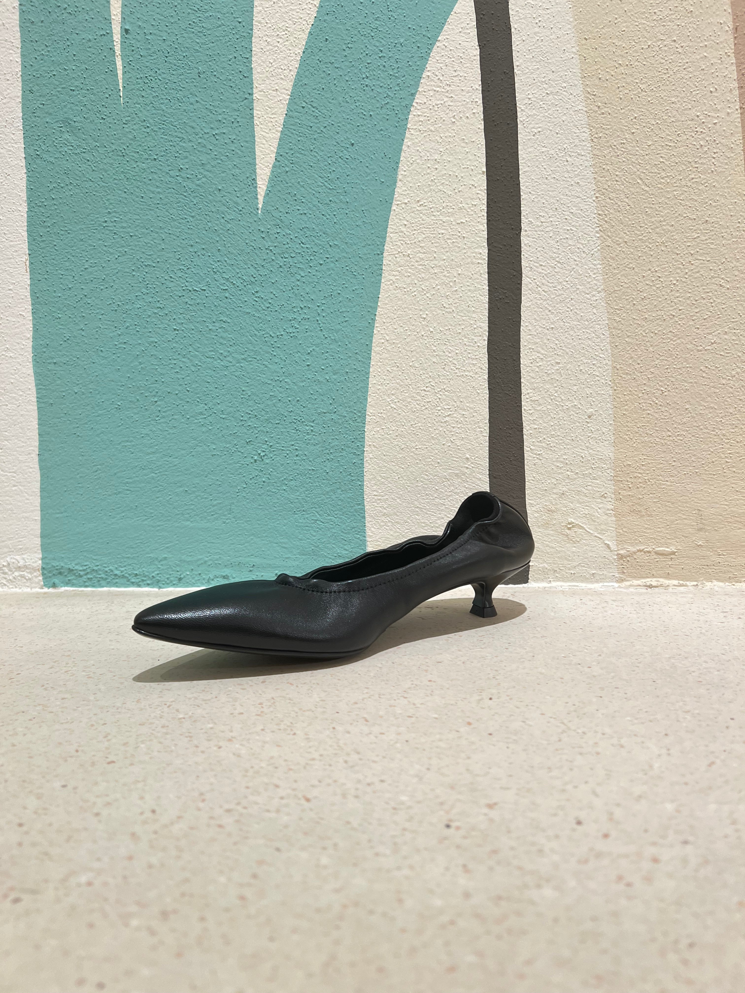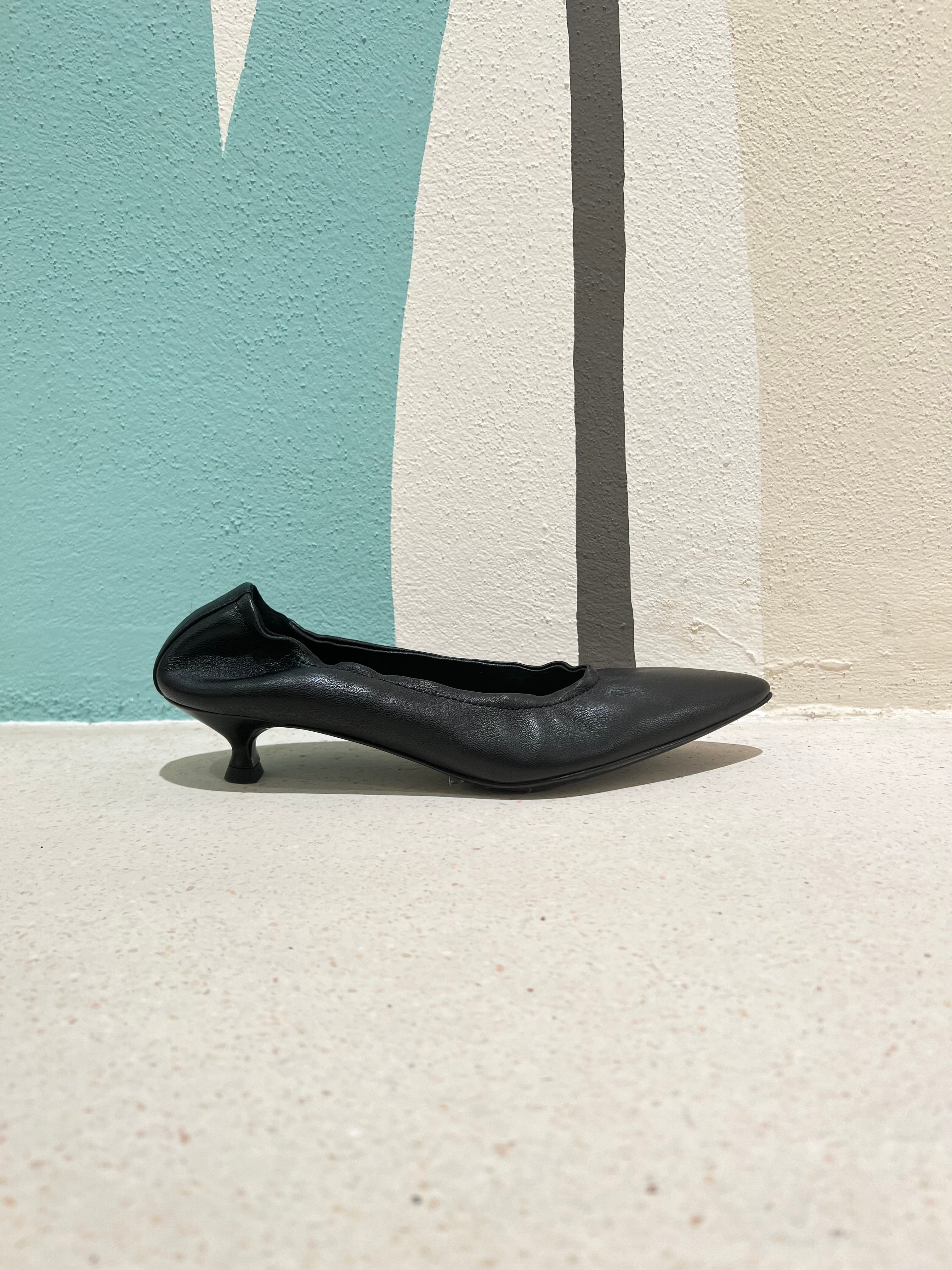 Pumps in nappa marrone con tacco basso, linea morbida arricciata lungo l’apertura