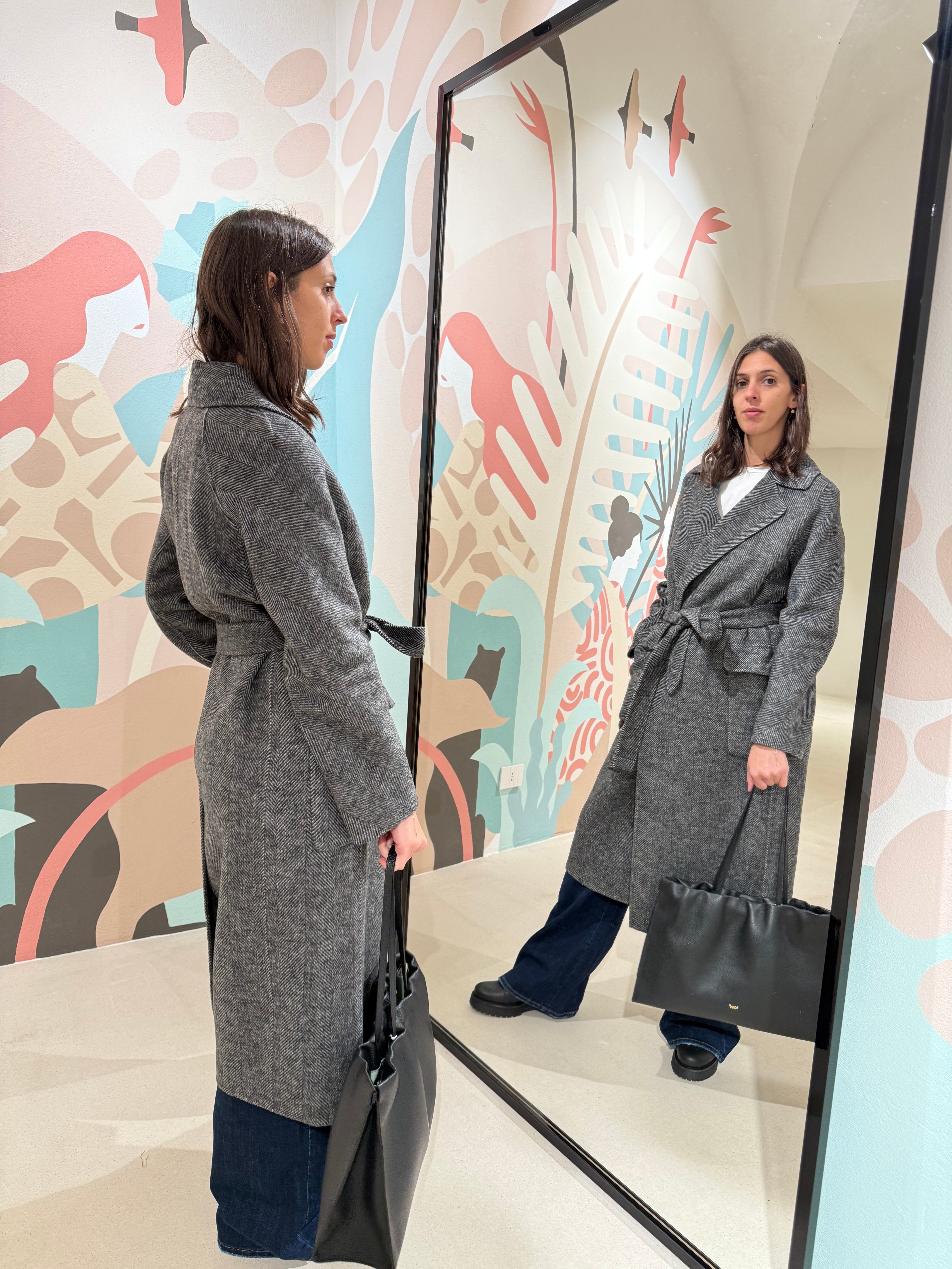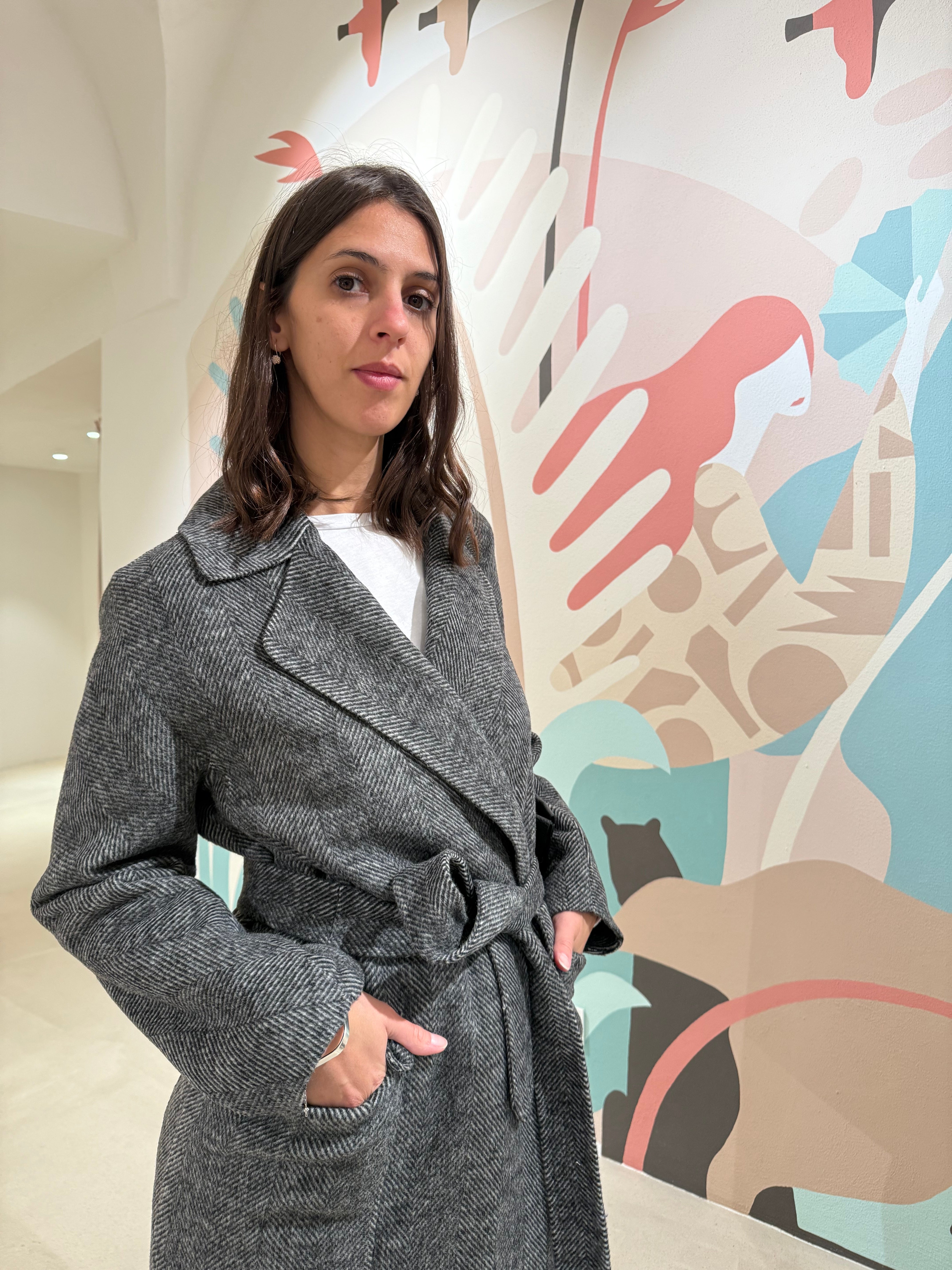 Cappotto spigato con cintura in vita removibile e tasche laterali