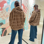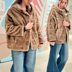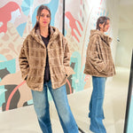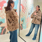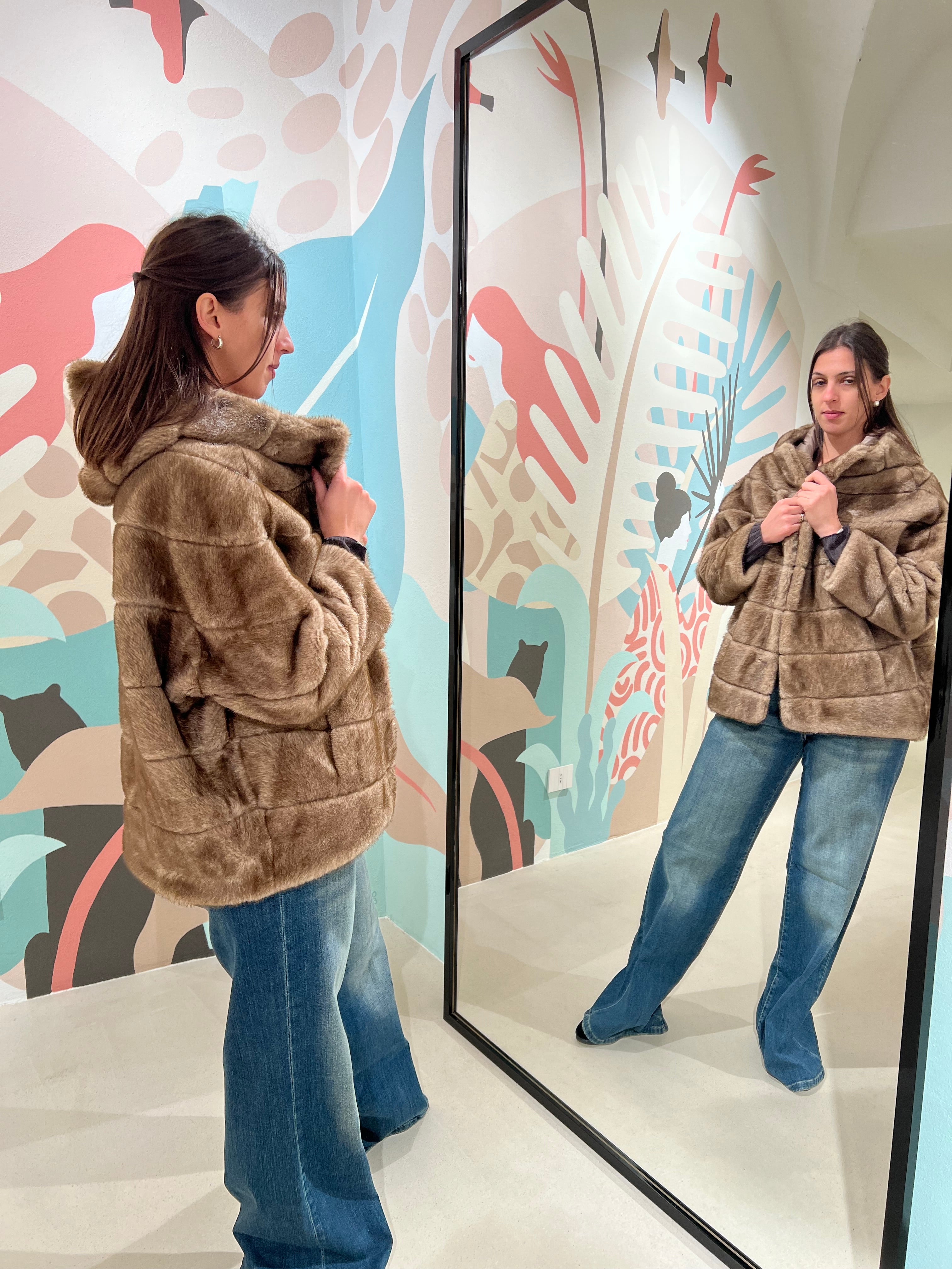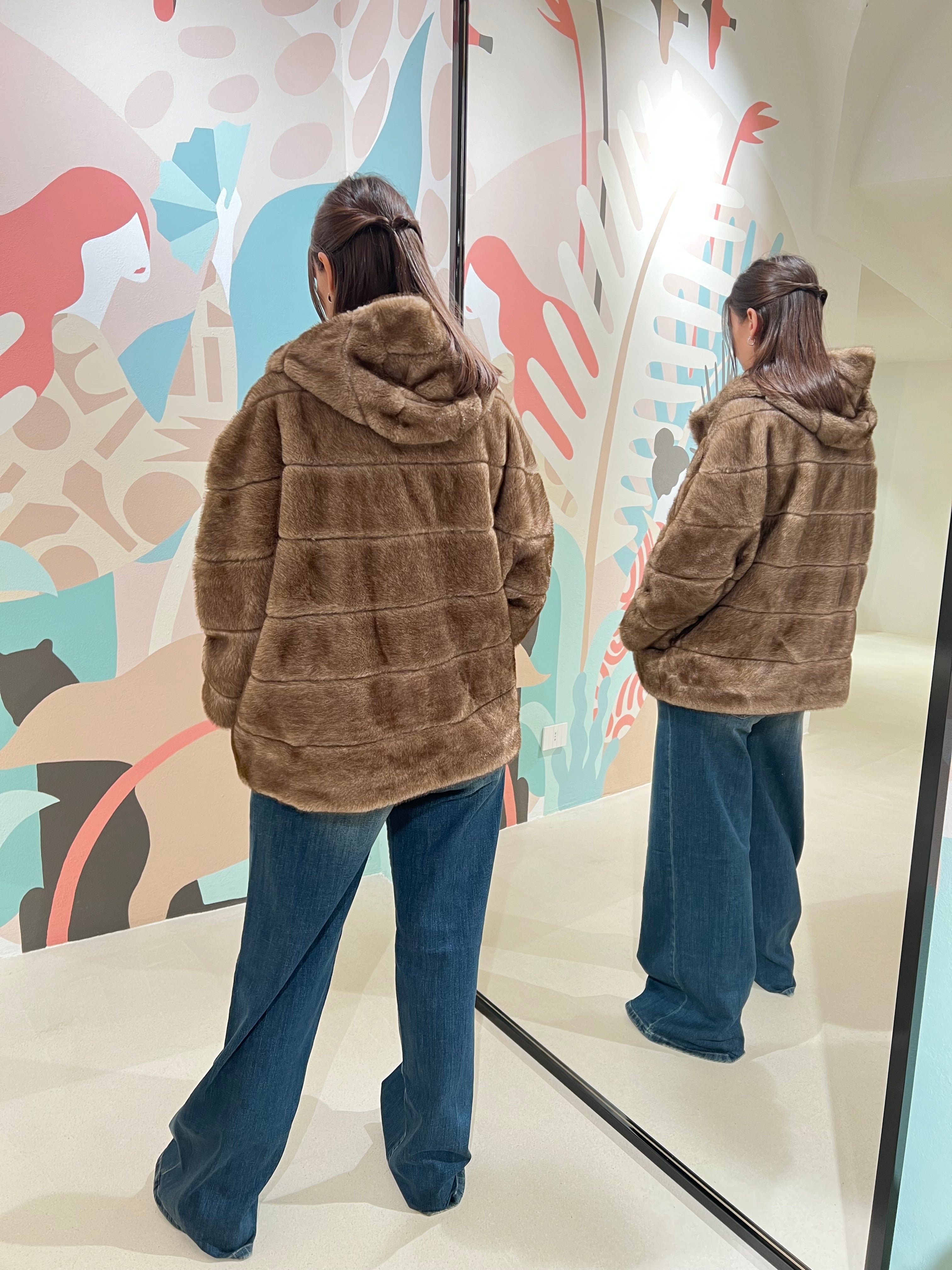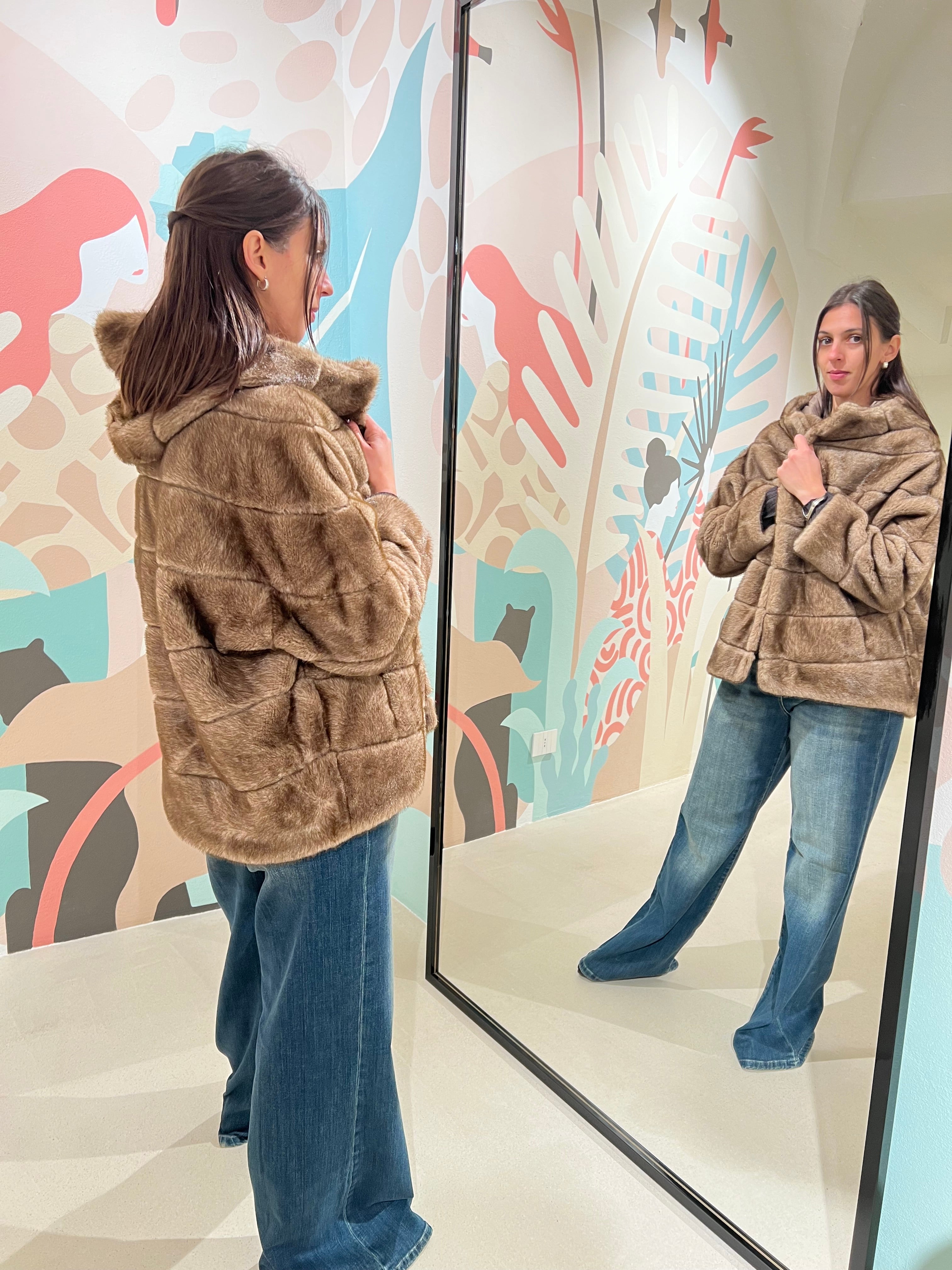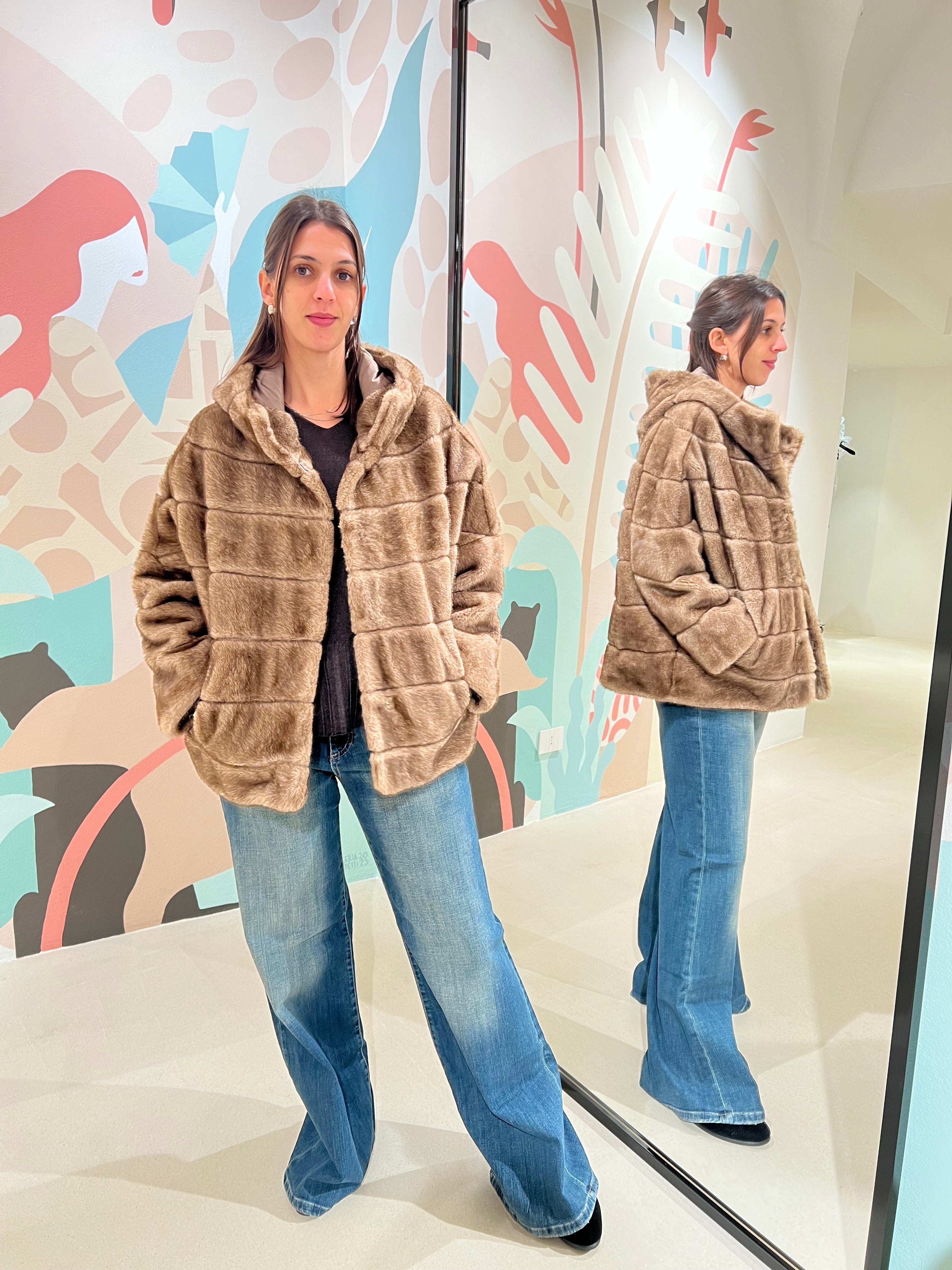 Eco Fur con cappuccio, tasche e chiusura gancetti frontali