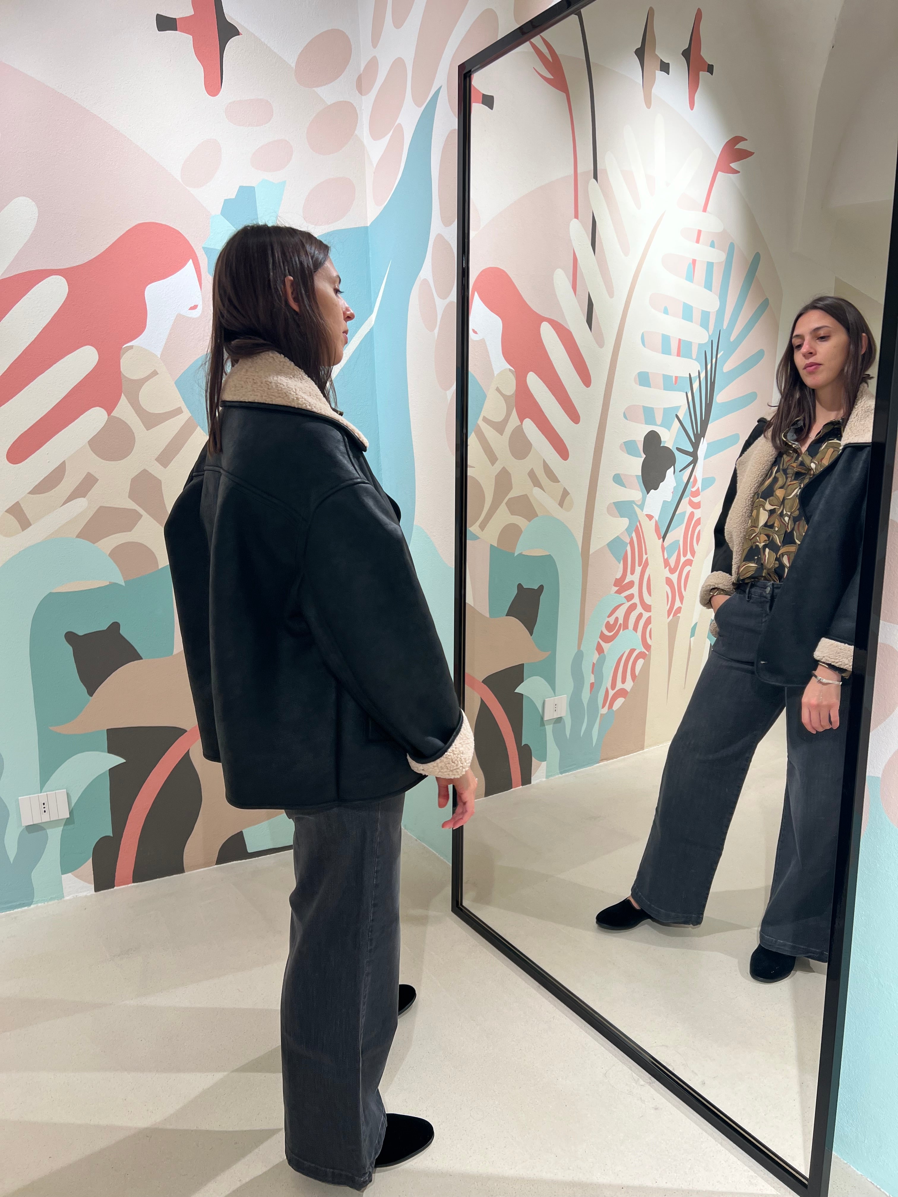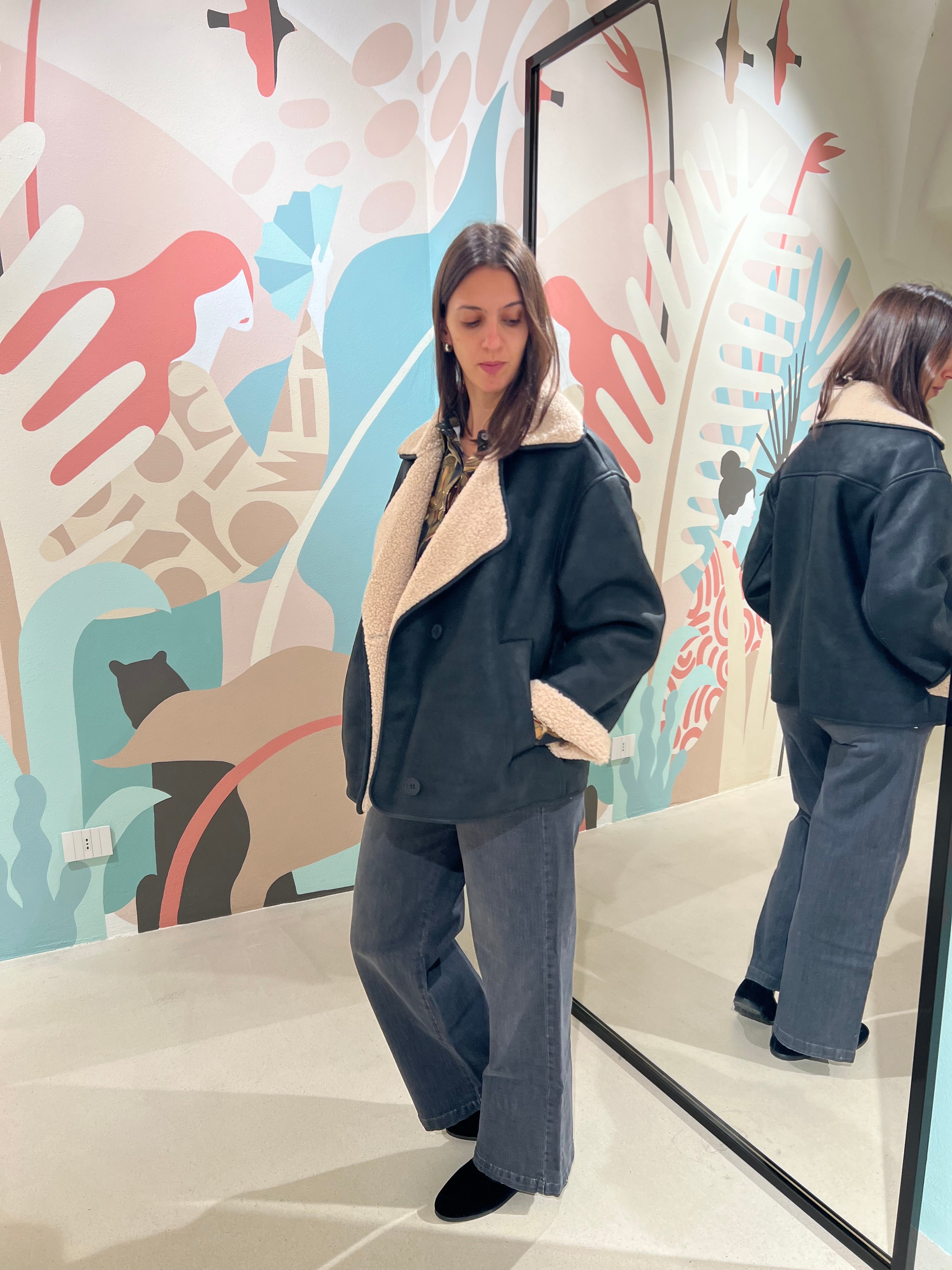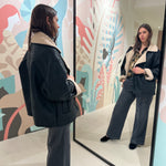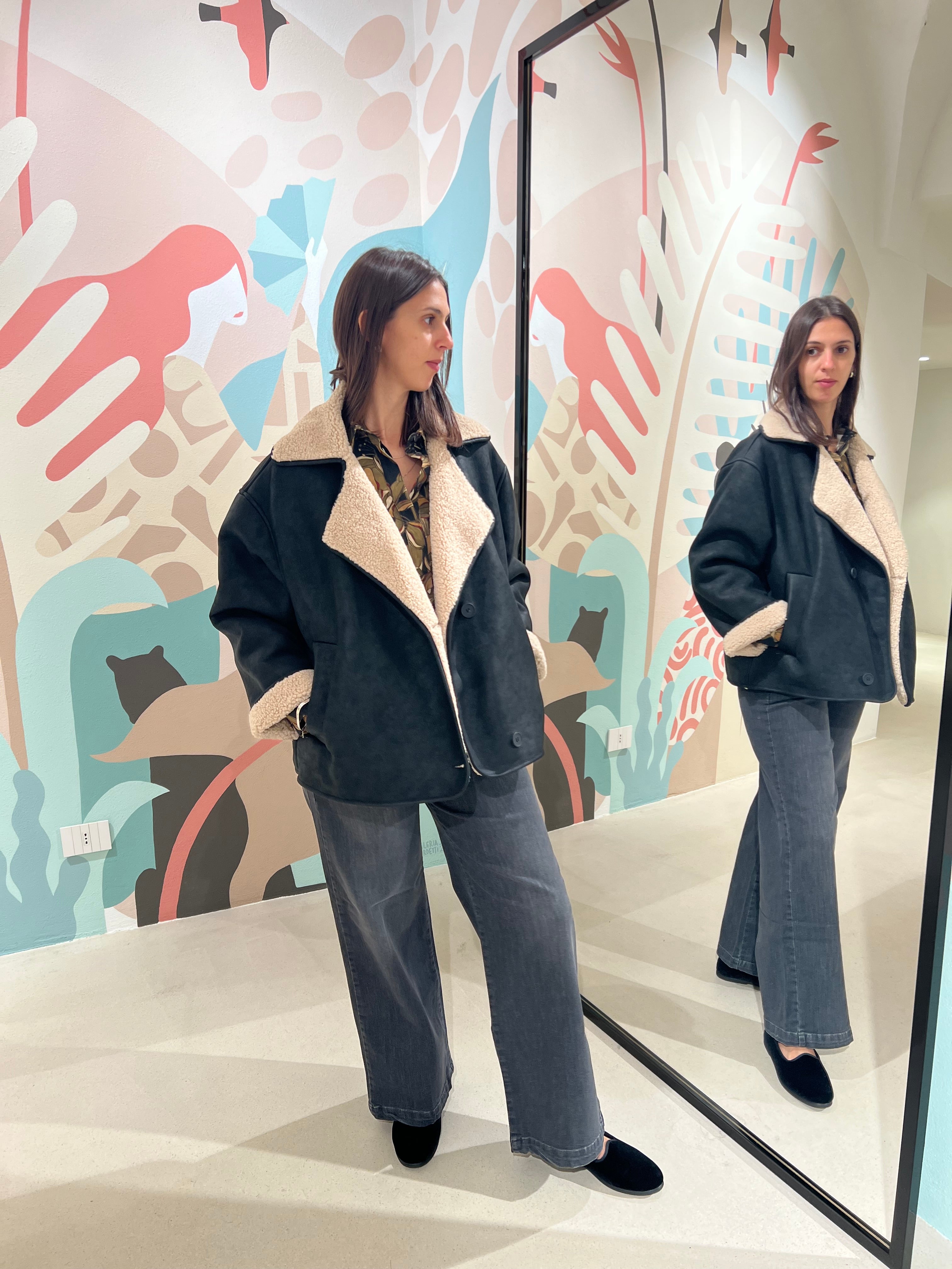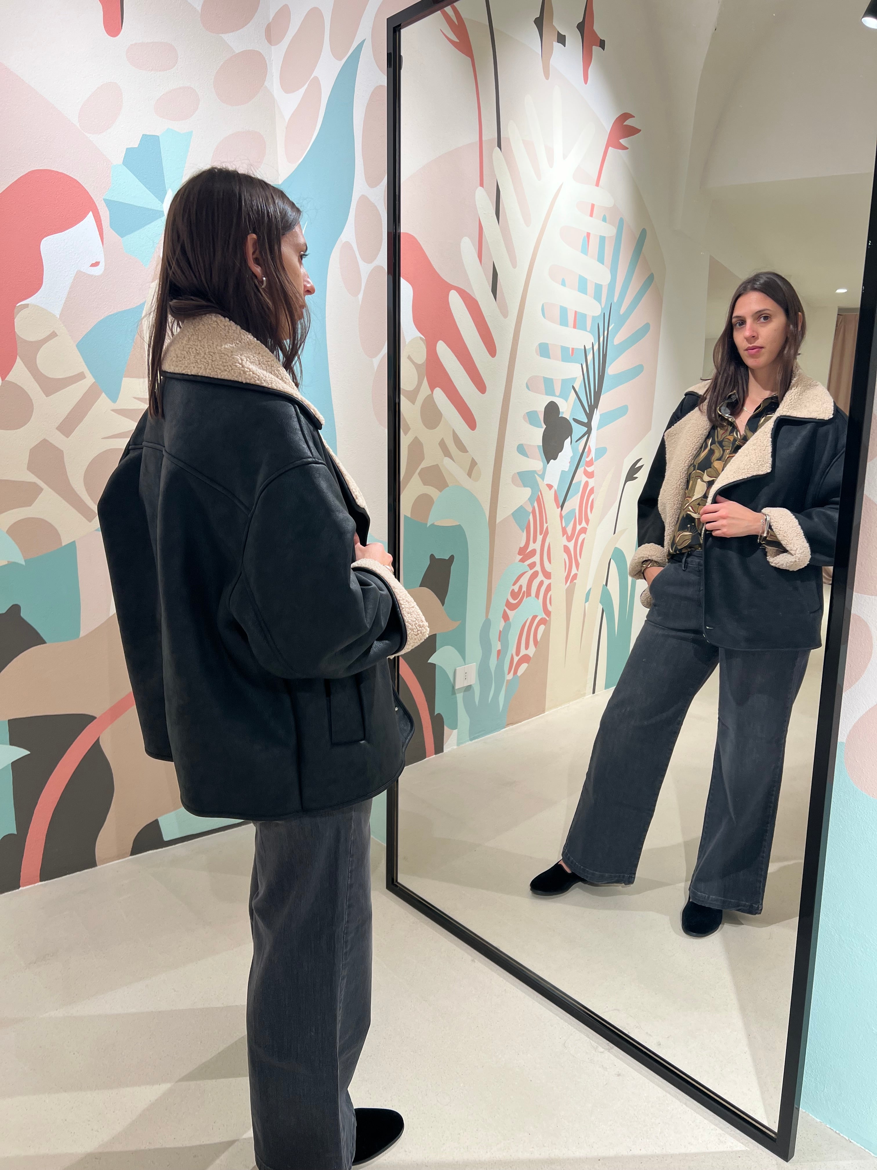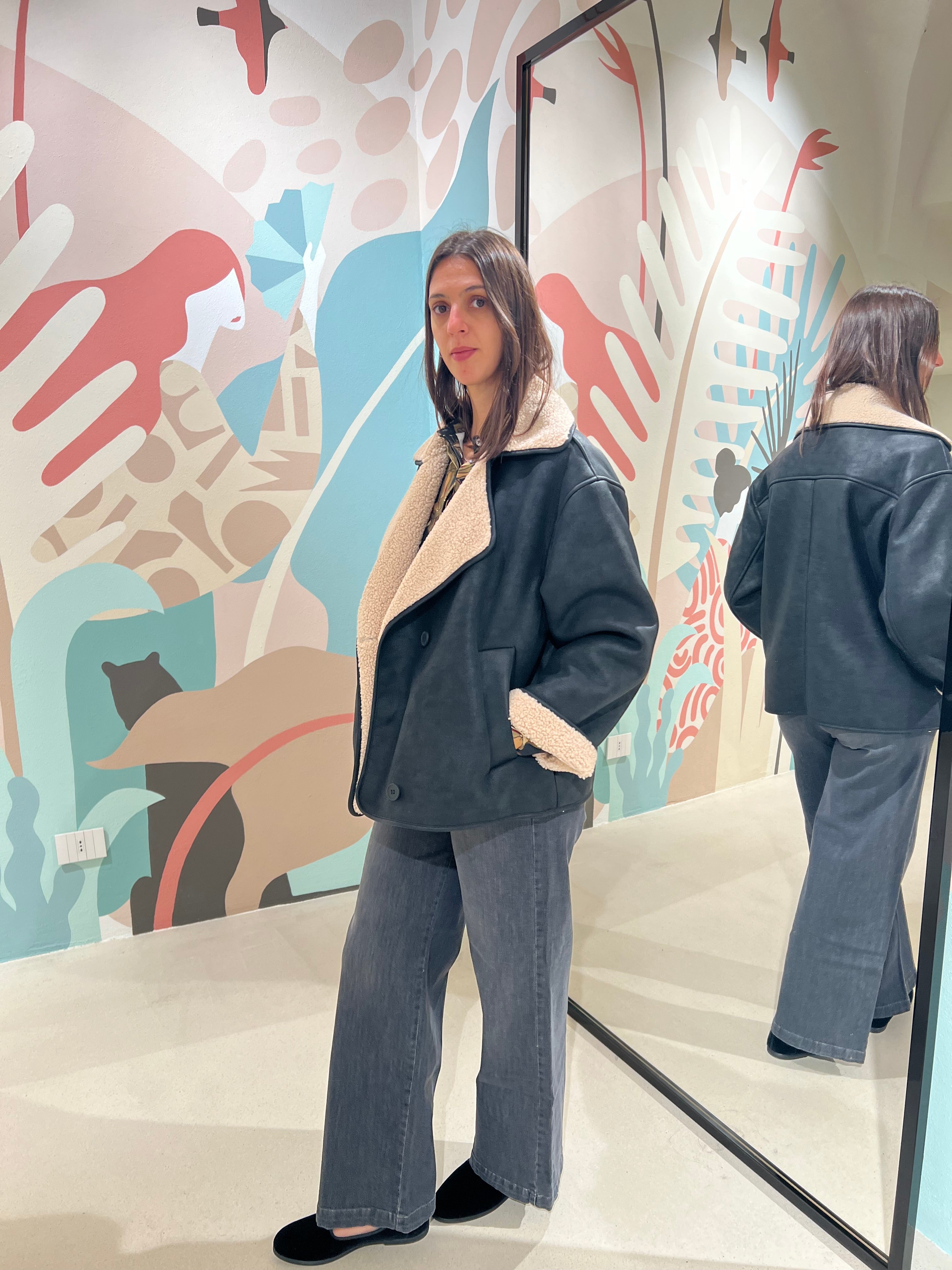 Giacca shearling nera con pelo (eco) a contrasto color burro, tasche laterali e chiusura bottoni frontali