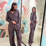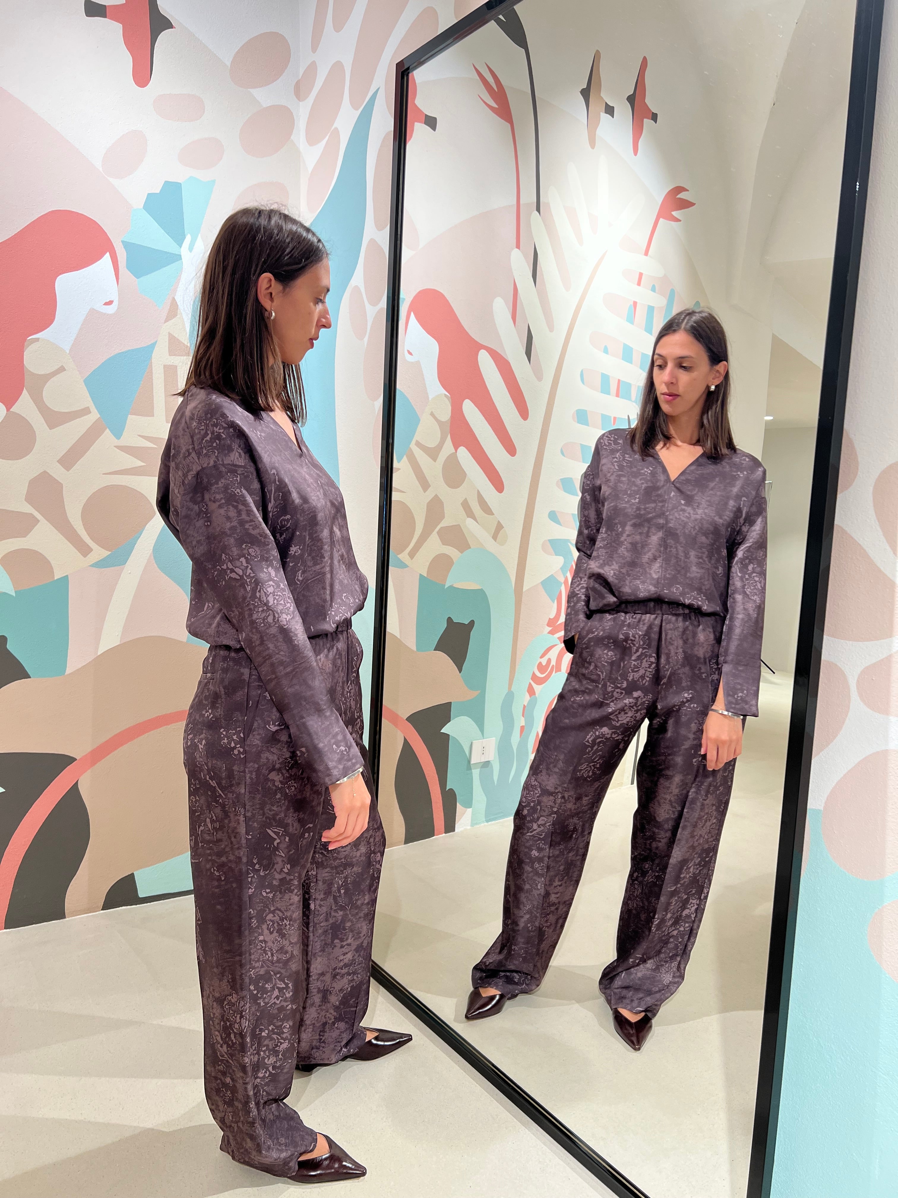 Pantalone ampio in seta stampata con coulisse in vita, zip laterale