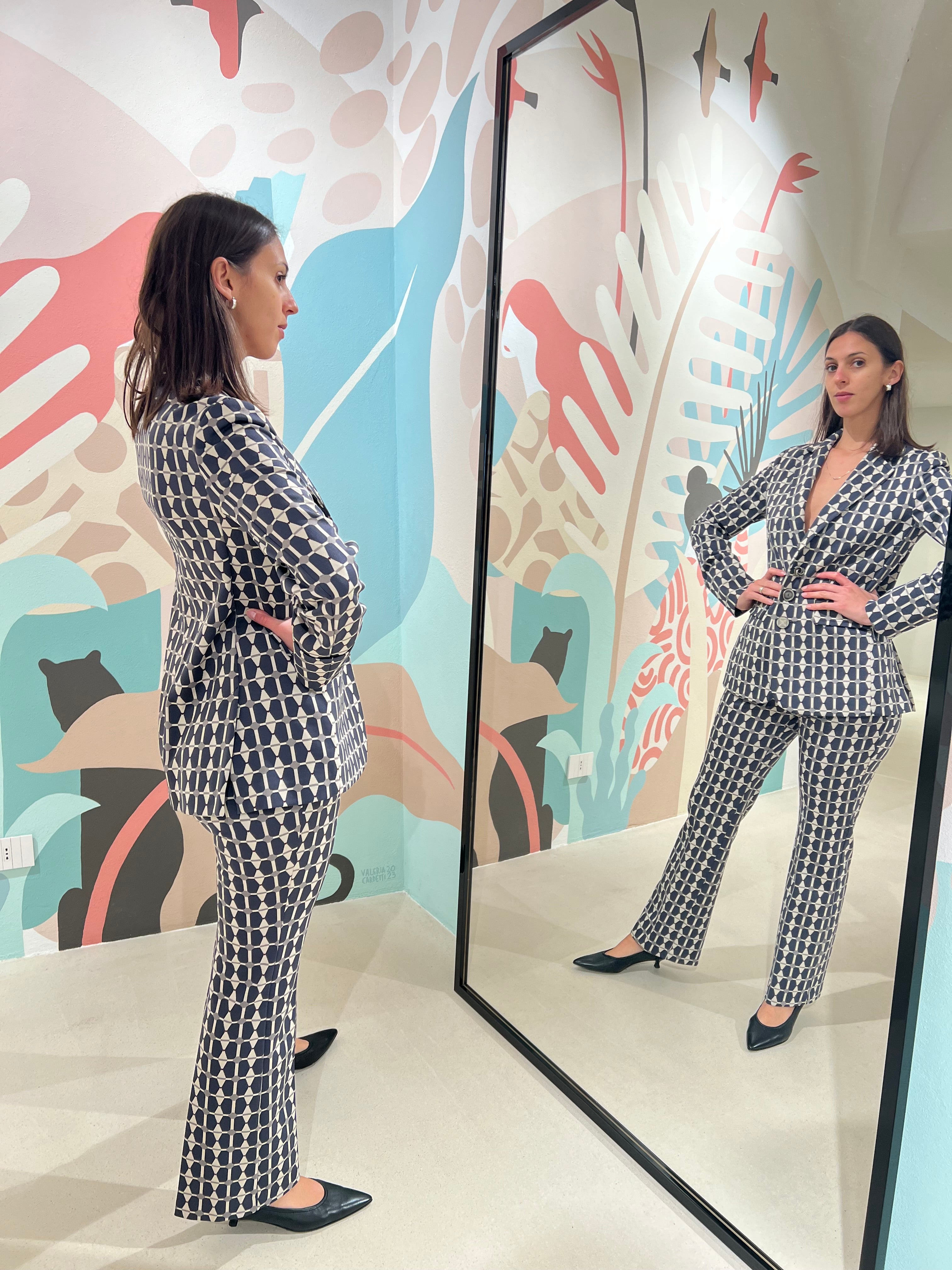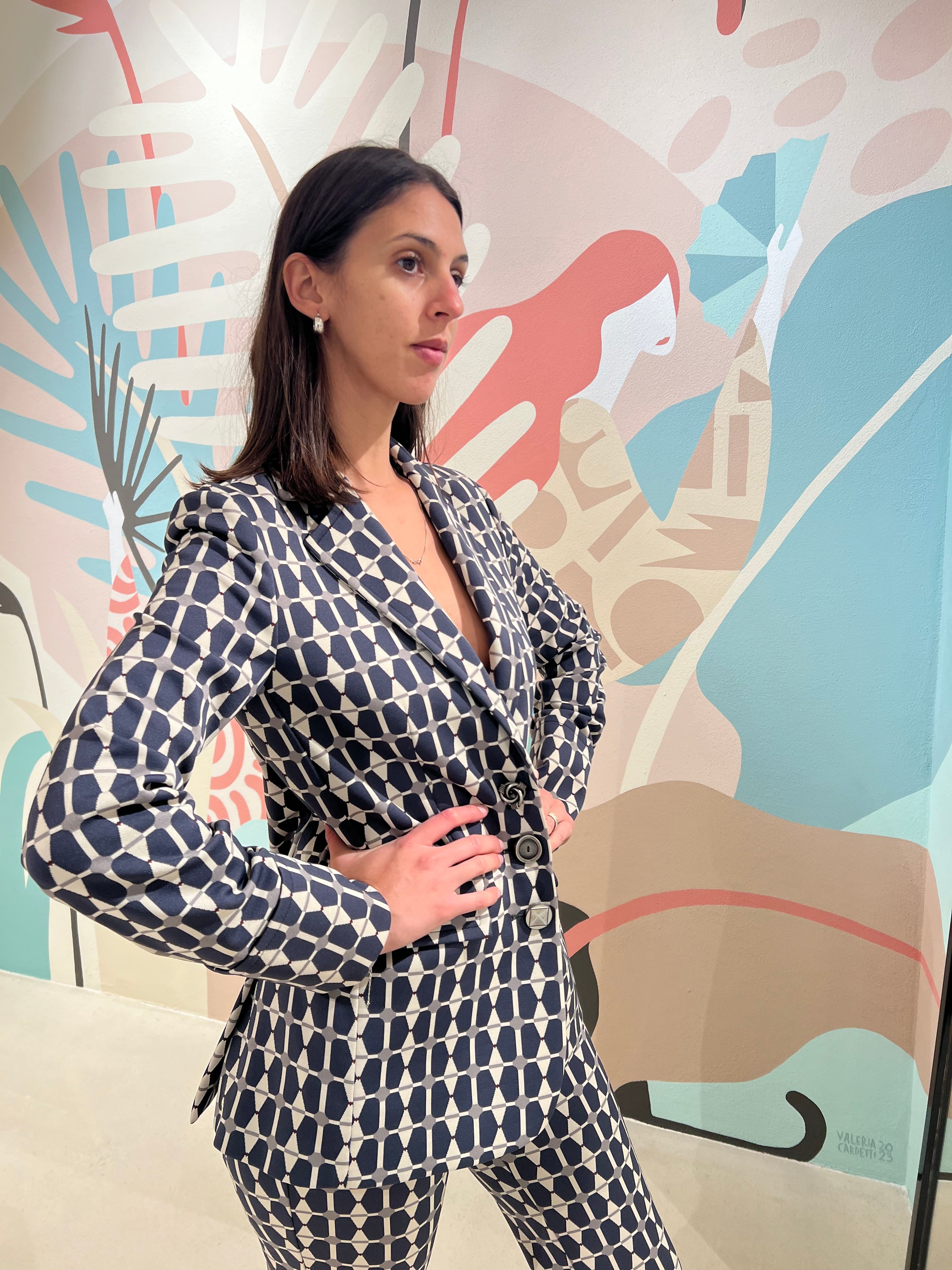 Giacca con vestibilitá slim, dettaglio bottoni centrali lavorati, fantasia geometrica