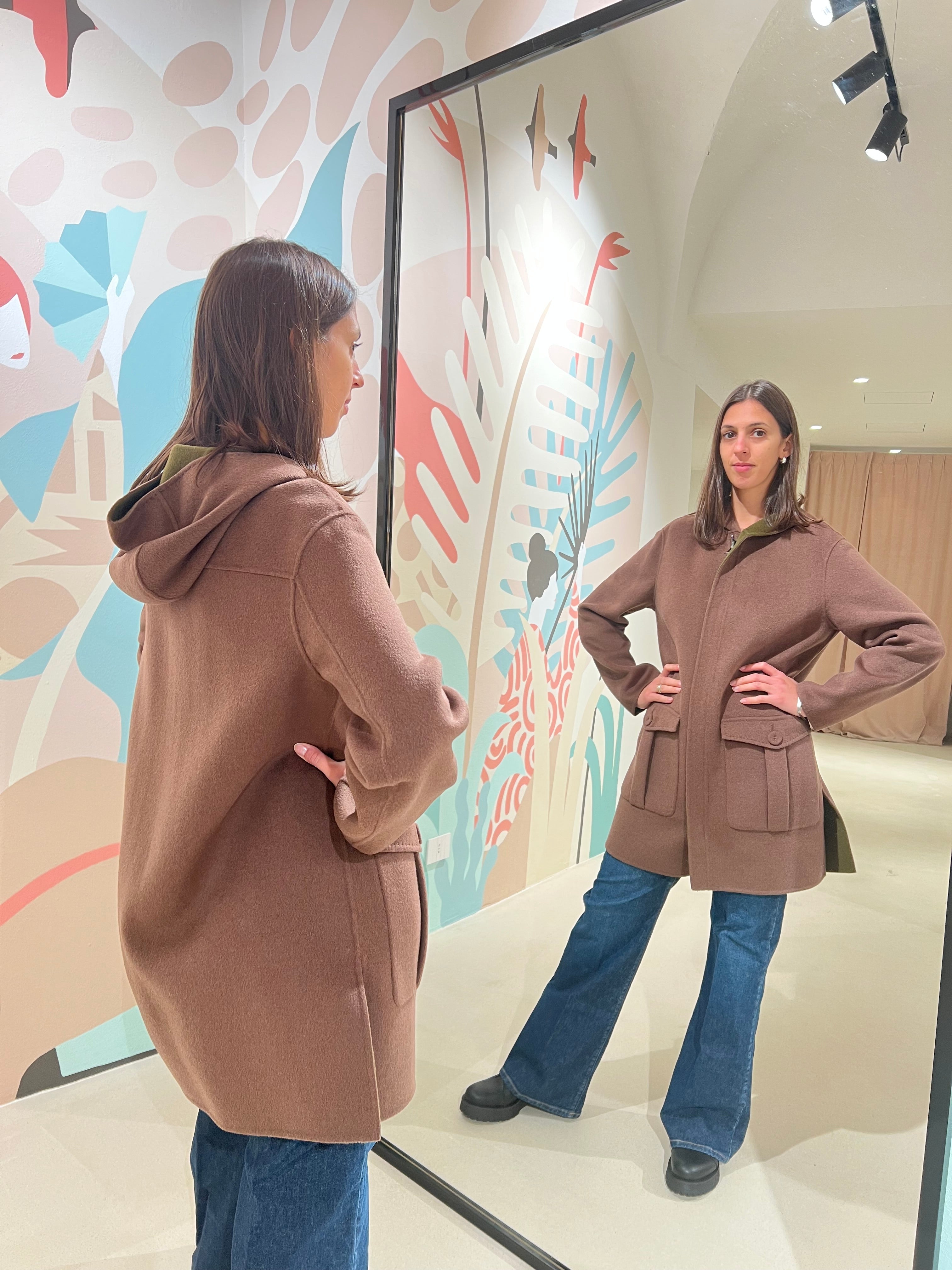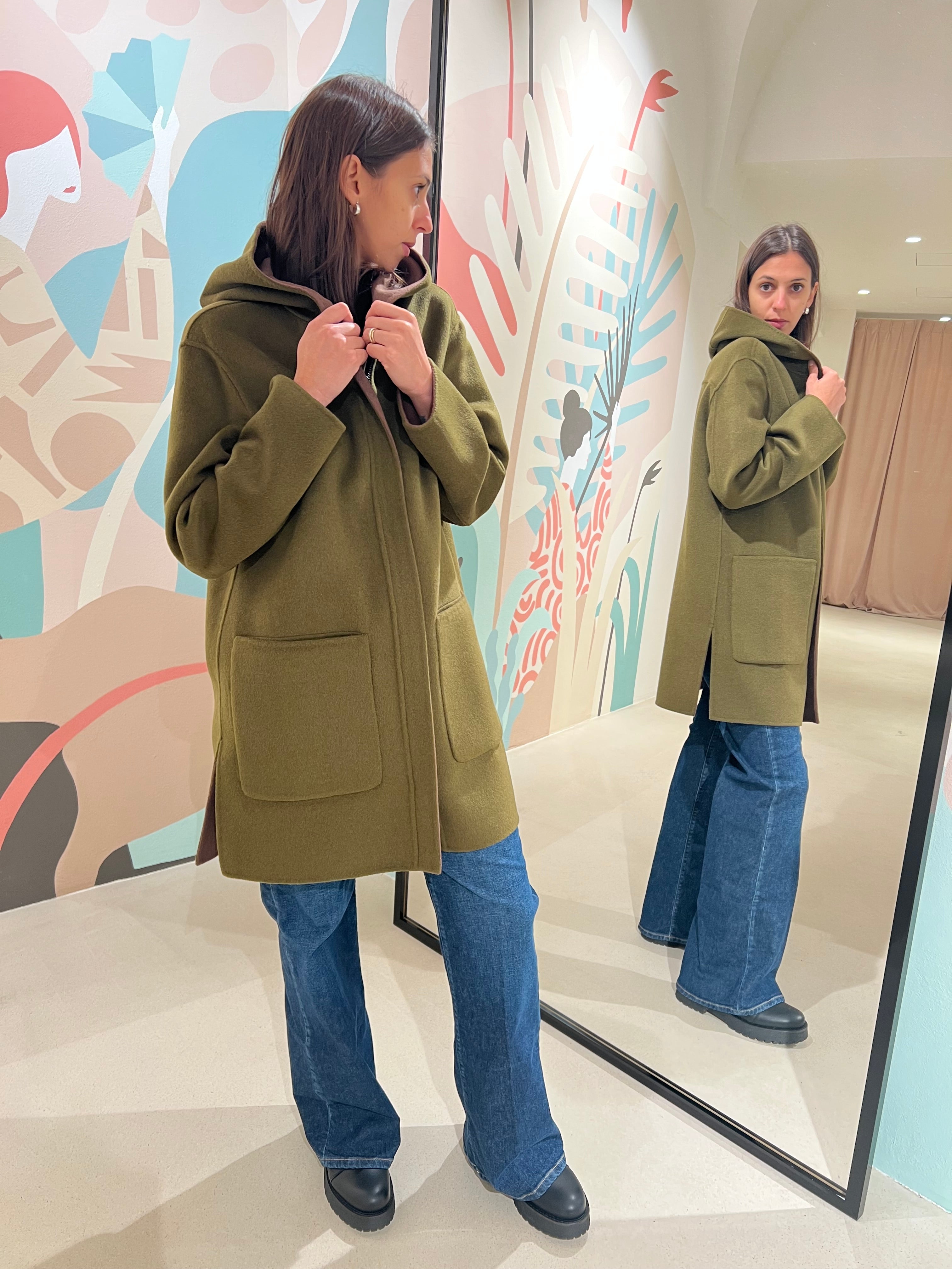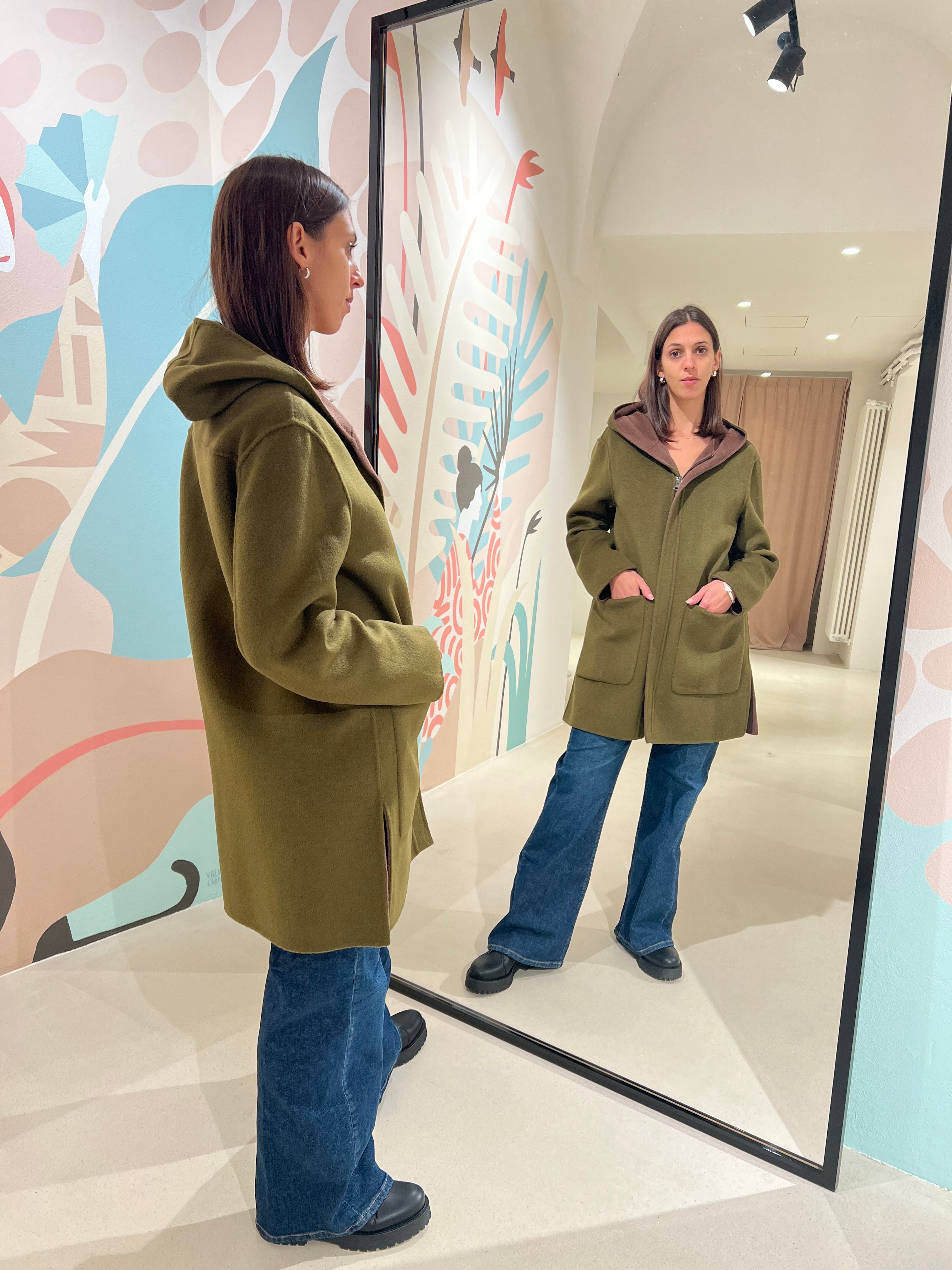 Giaccone con cappuccio reversibile, chiusura zip frontale e tasche laterali