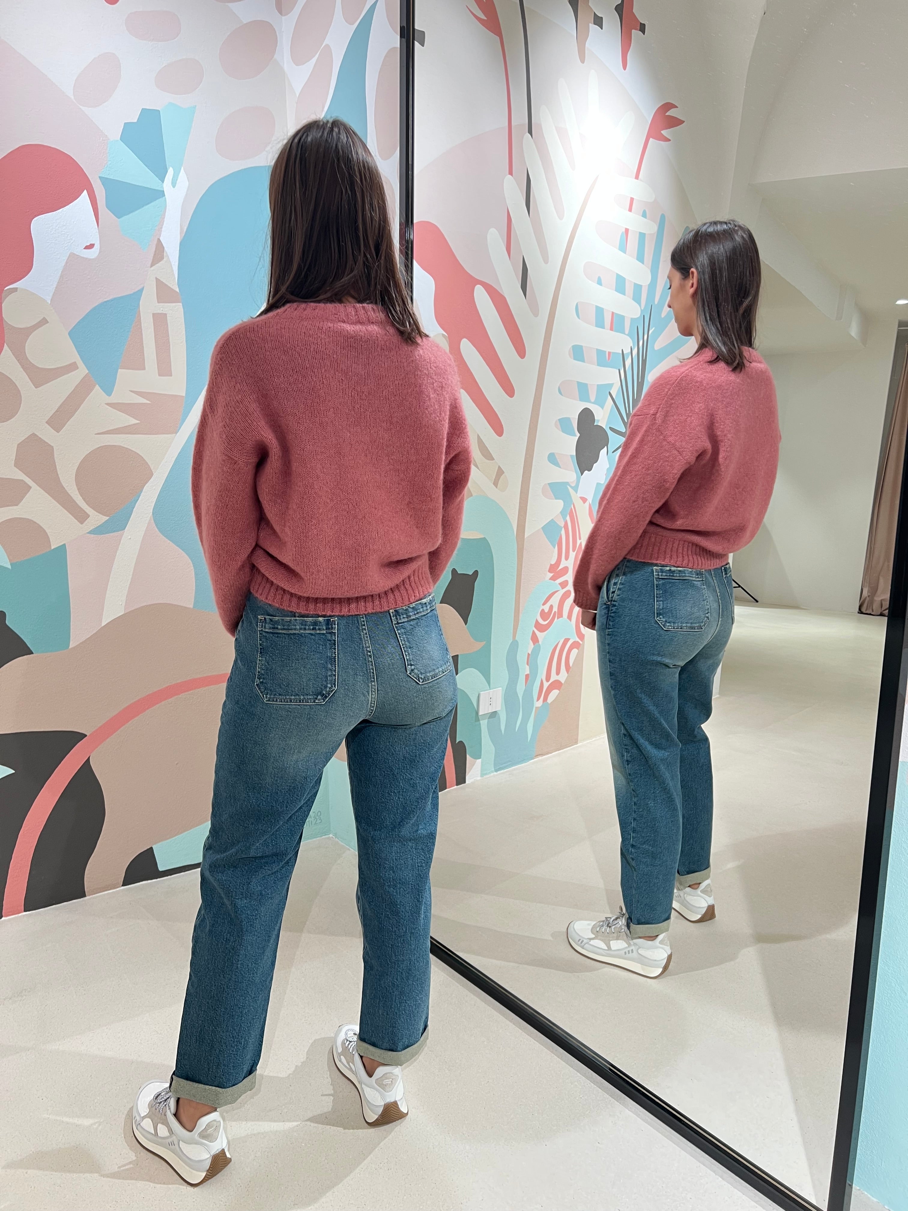 Jeans dritto effetto slavato con tasche laterali e chiusura zip frontale