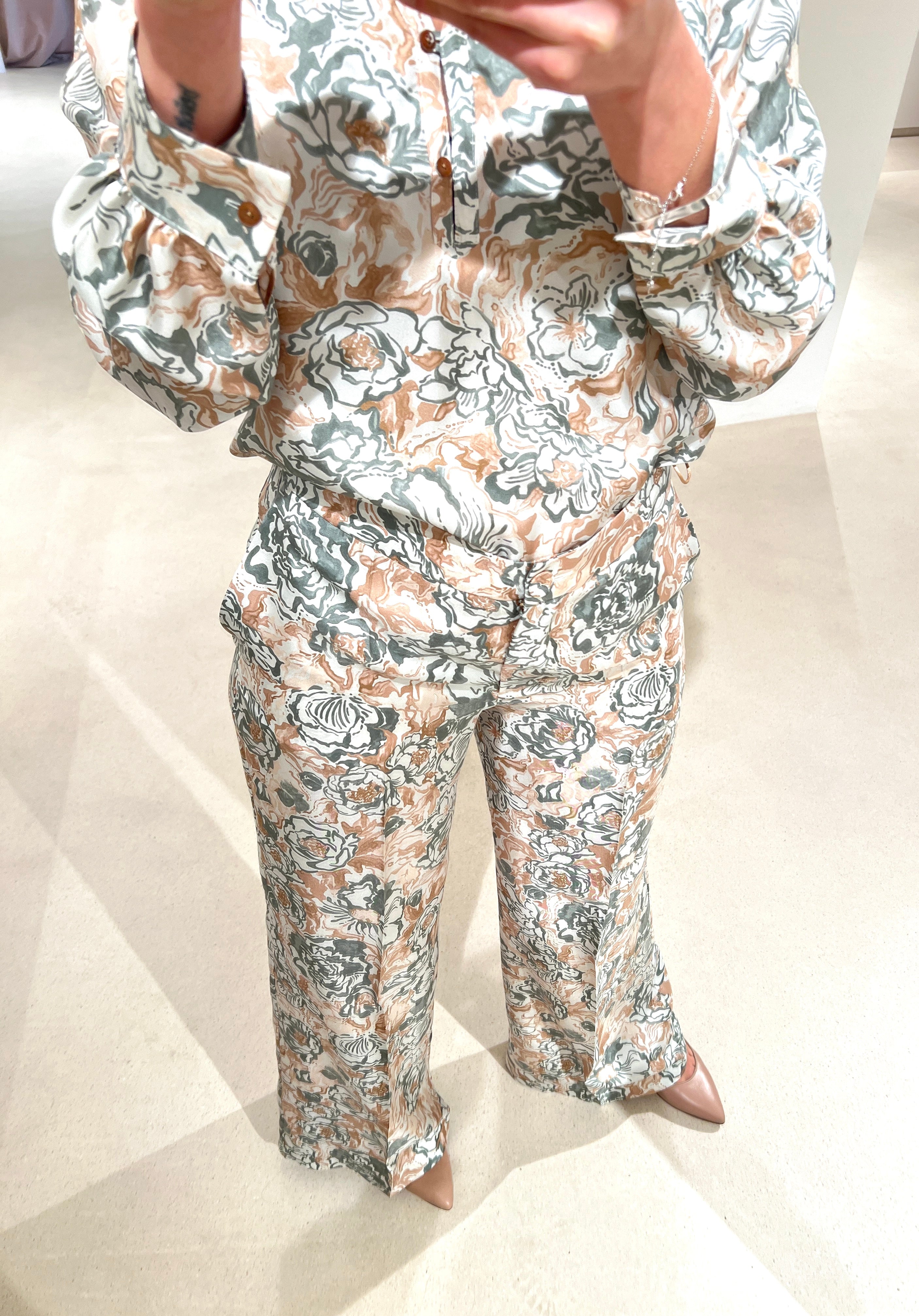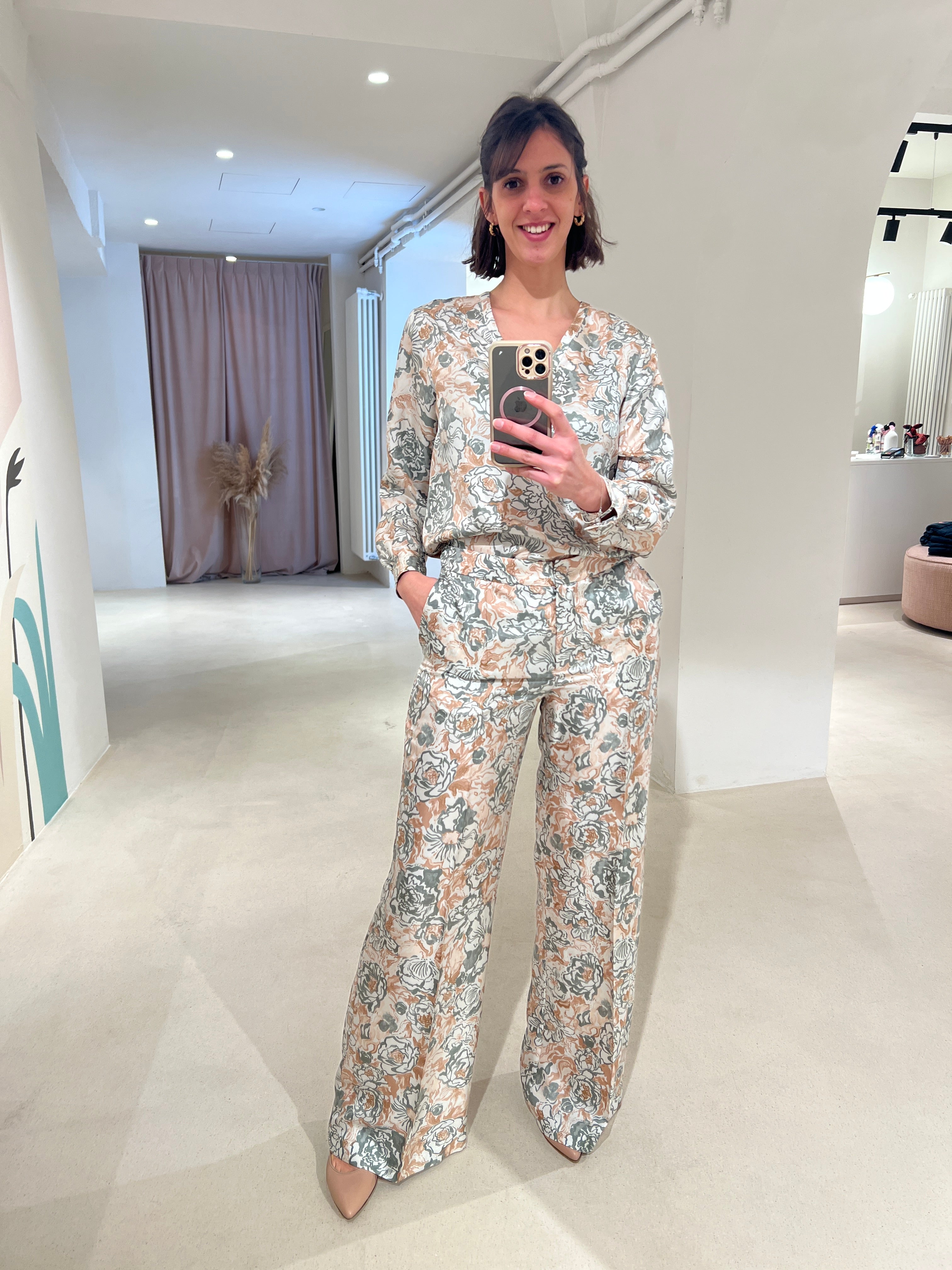Pantalone palazzo in twill di seta stampato. Il cinturino costruito con bottone e le tasche alla francese donano un look sartoriale, la cui silhouette a vita alta è spiccatamente femminile.