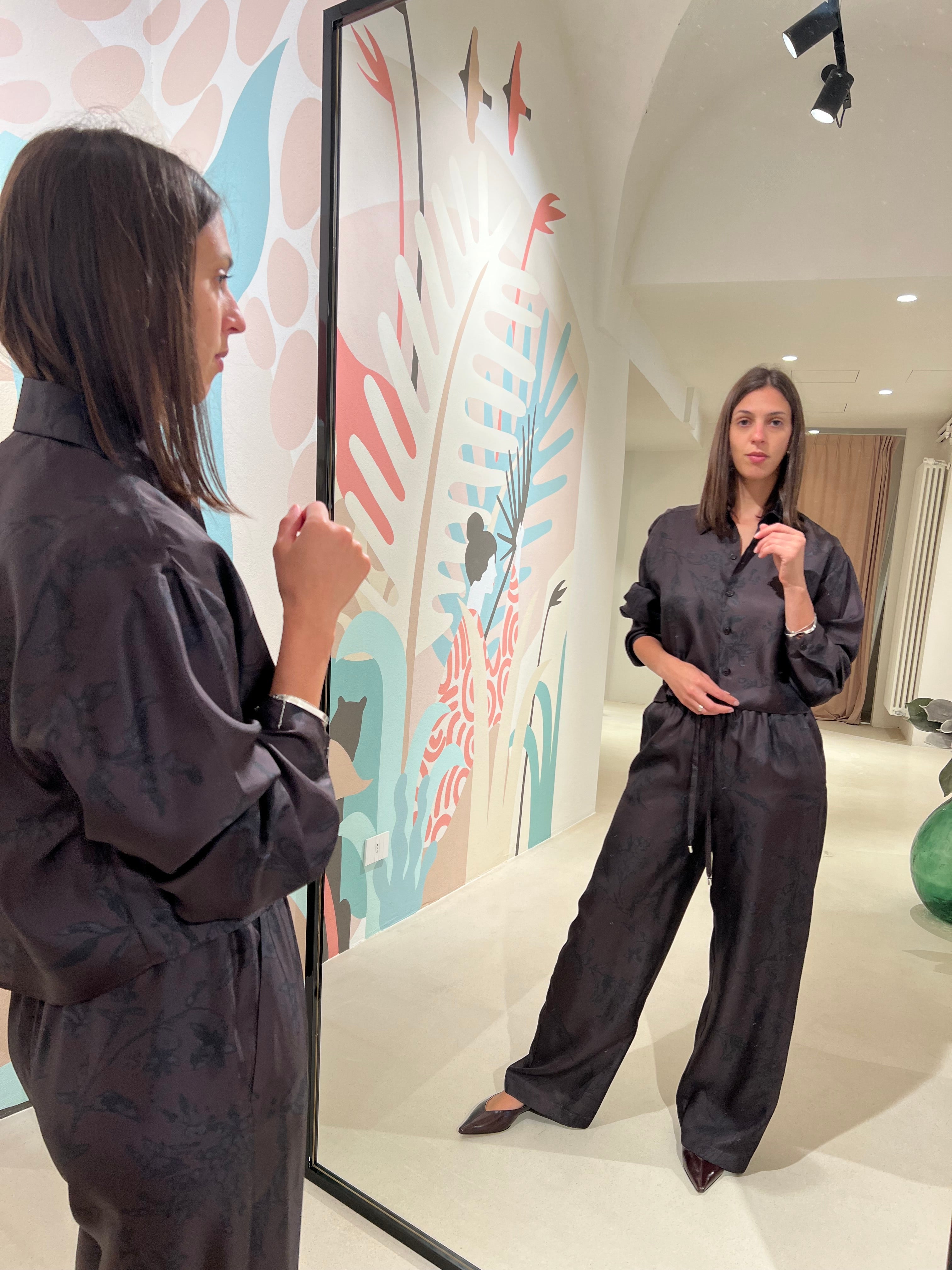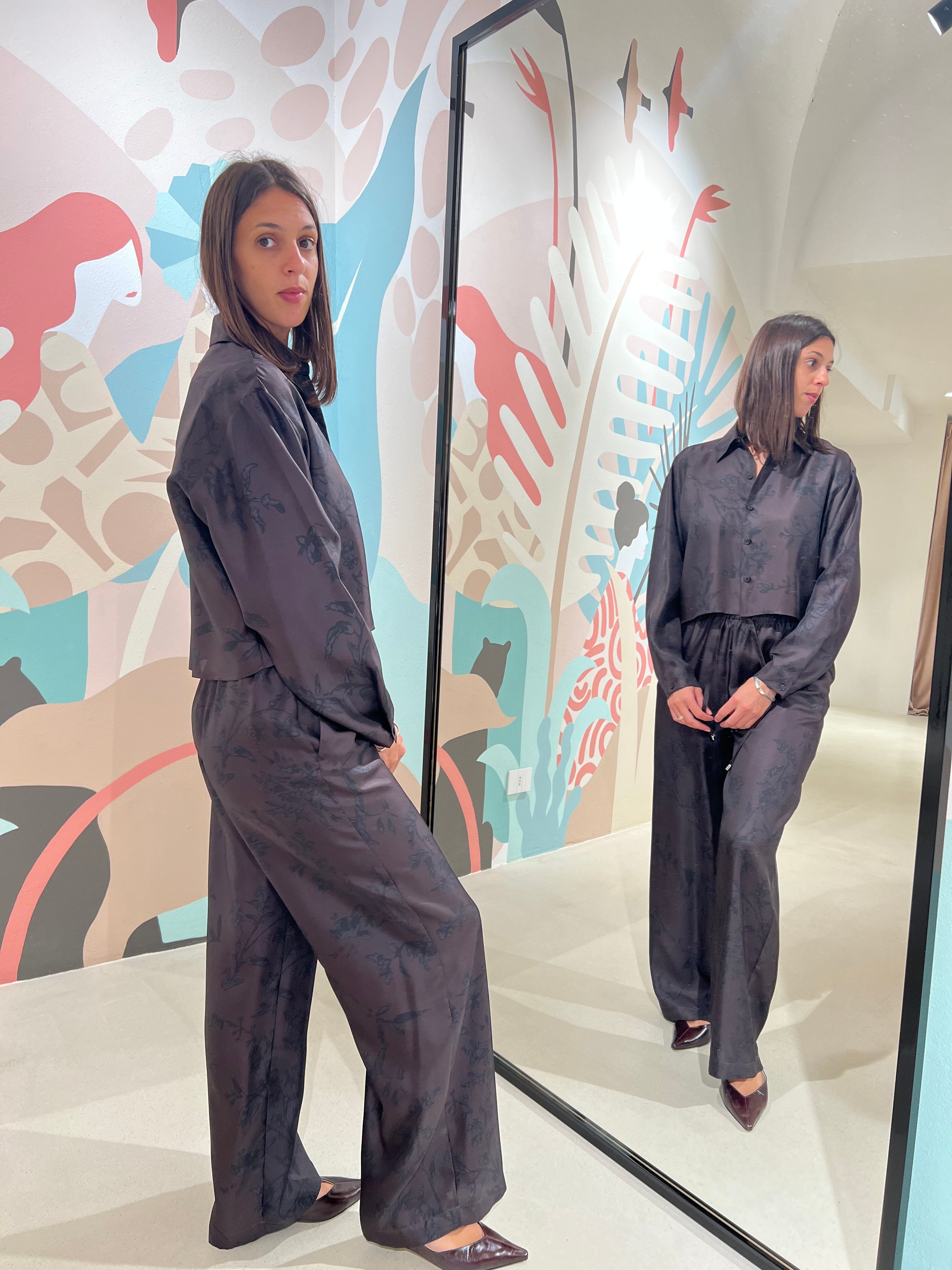 pantalone ampio in seta con stampa floreale con coulisse in vita