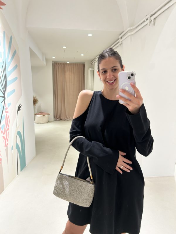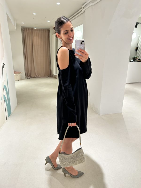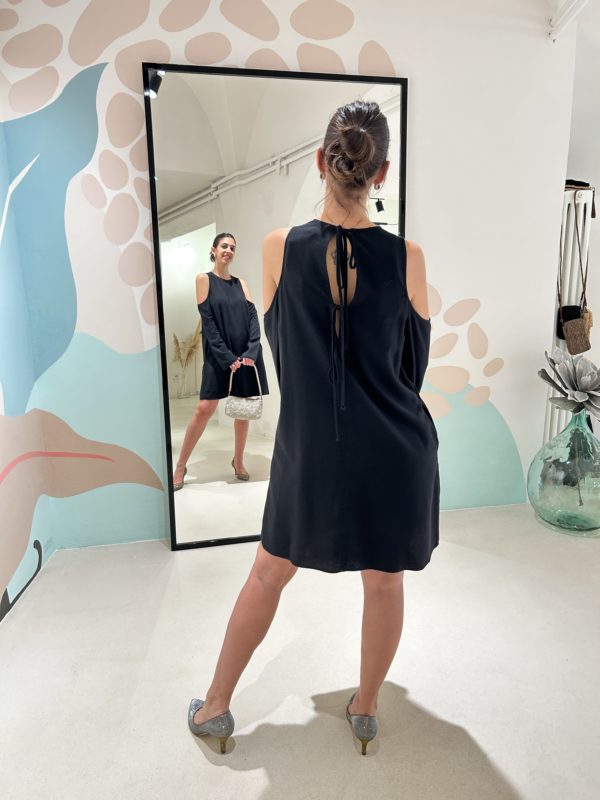 Abito corto con dettagli fiocchi sulla schiena e manica con spalla nuda
