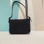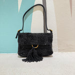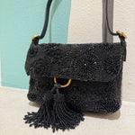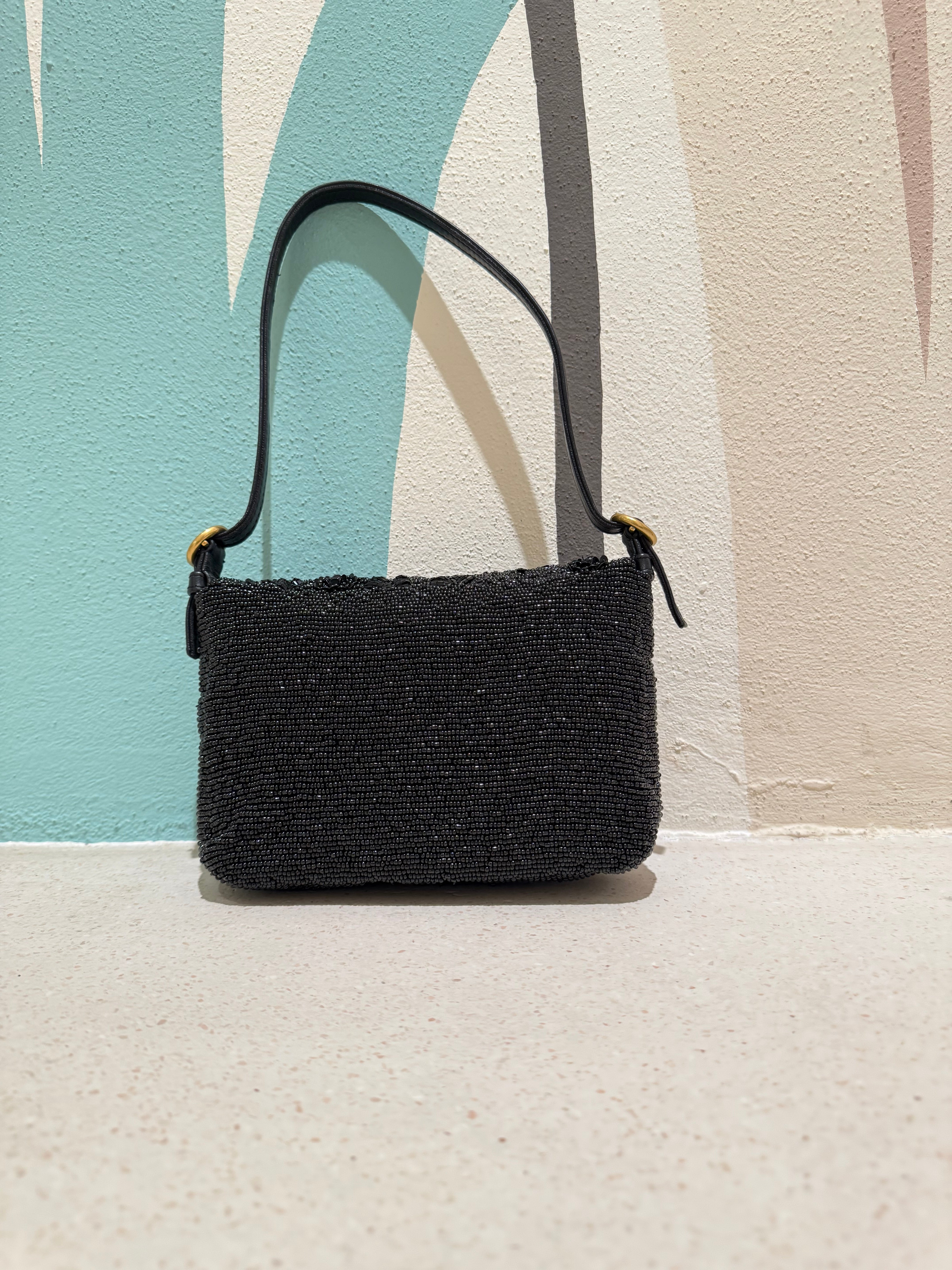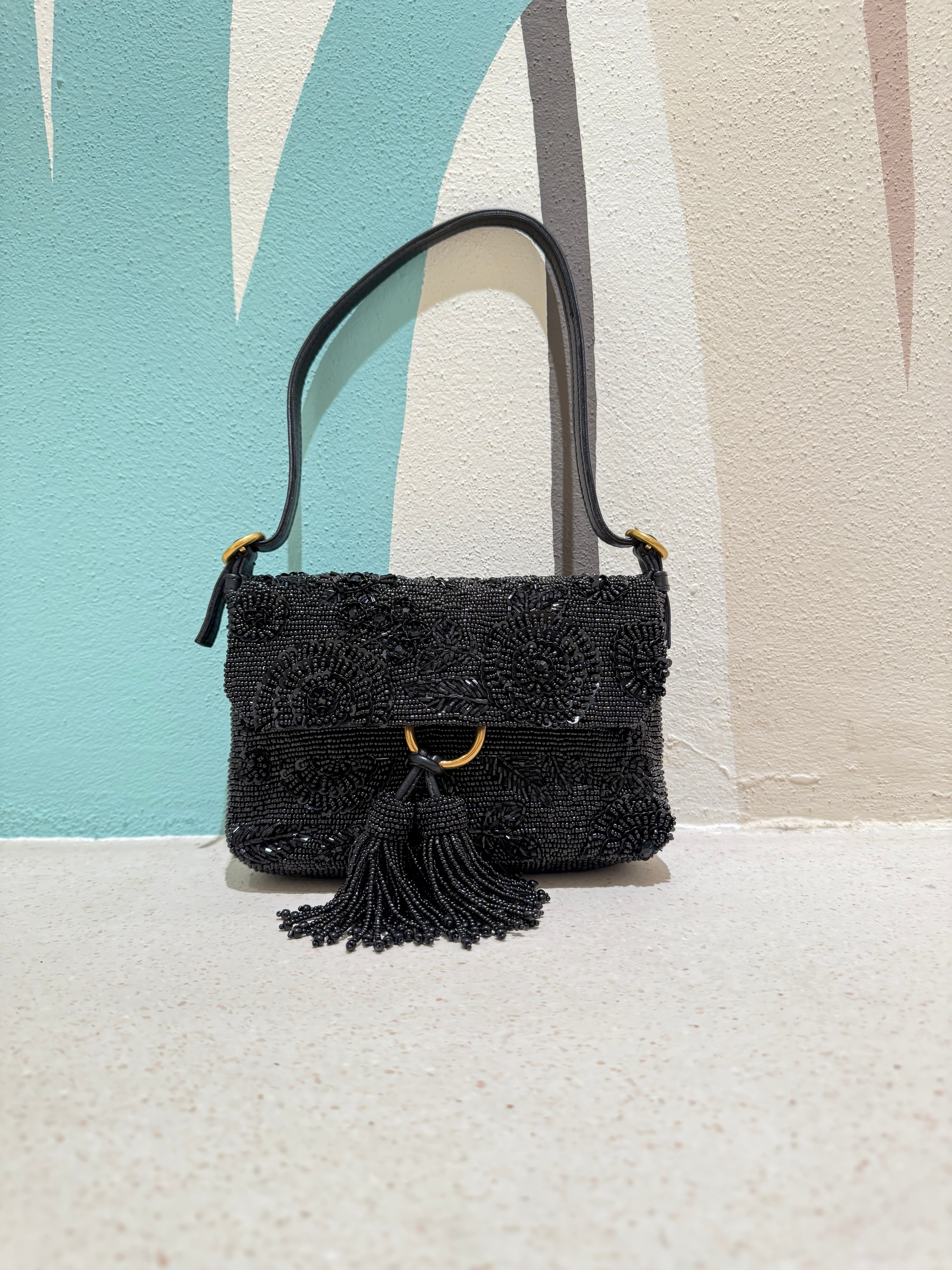 Un giardino invernale totalmente ricamato a mano. Questa mini baguette è un vero gioiello di perline, paillettes e cuts ricamati con amore, uno ad uno, fino a comporre un delicato disegno floreale. Un anello metal e due nappine totalmente ricamate ne completano la chiusura. La tracolla in pelle tono su tono è chiusa da fibbie gold logate.